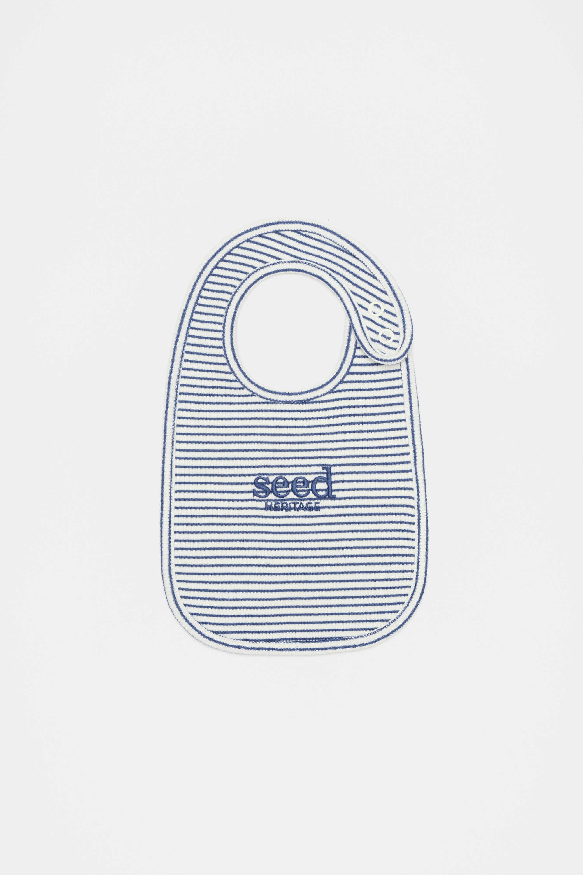 This classic bib features an embroidered Seed Heritage logo, a stripe pattern, and a rib texture. Crafted from soft stretch cotton, the bib has snap fastenings at the neck for easy changes.