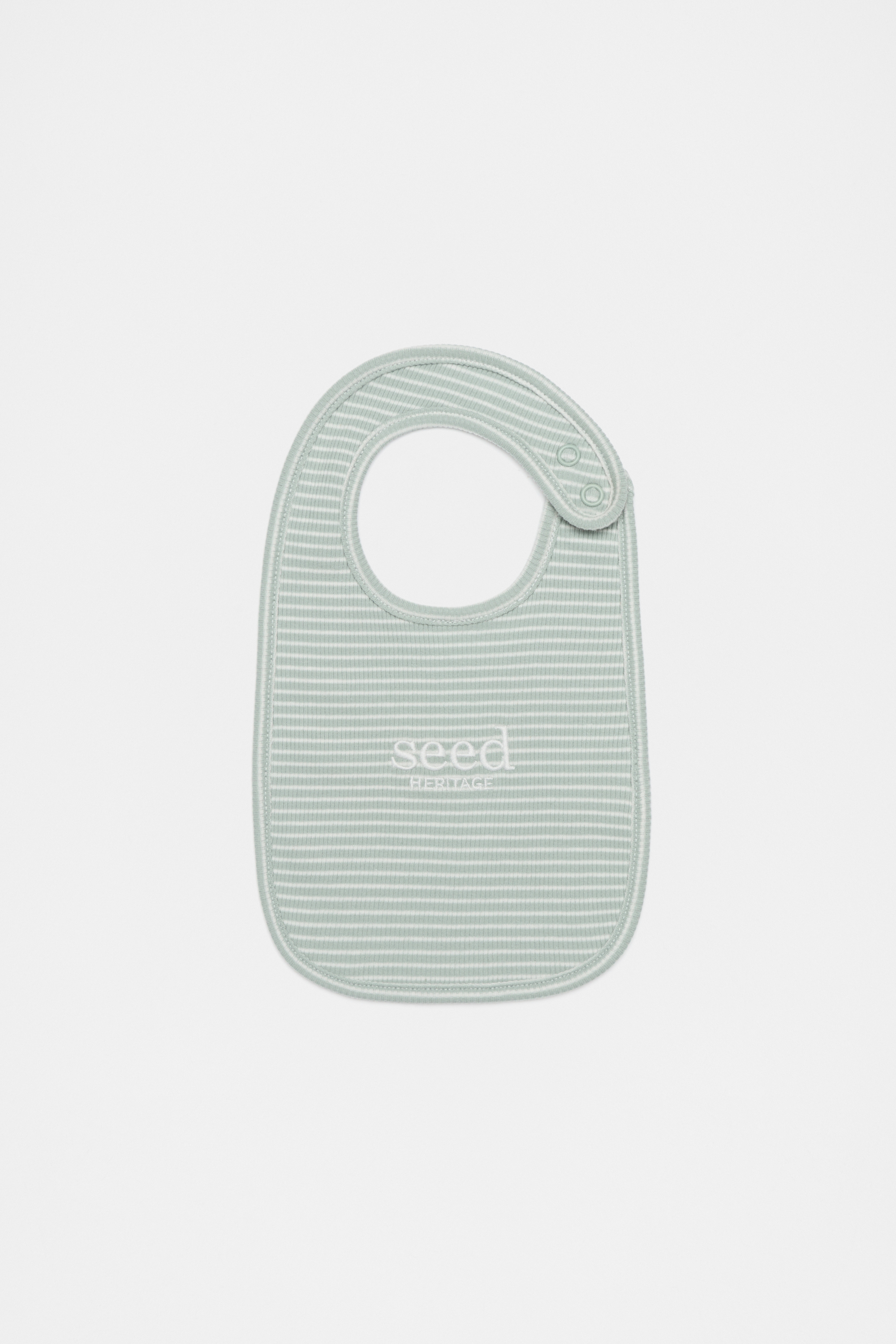 This classic bib features an embroidered Seed Heritage logo, a stripe pattern, and a rib texture. Crafted from soft stretch cotton, the bib has snap fastenings at the neck for easy changes.