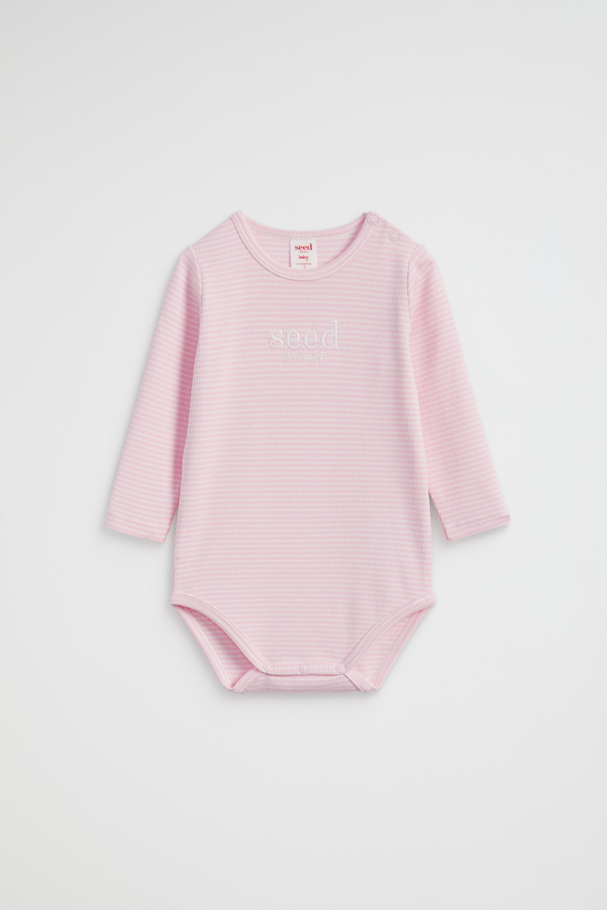 Made from an ultra-soft cotton blend with the perfect amount of stretch and a ribbed texture, this long-sleeved bodysuit is a must-have for any newborn. The round-neck bodysuit features an embroidered Seed Heritage logo, as well as snap fastenings at the neckline and a gusset for quick and easy changes.