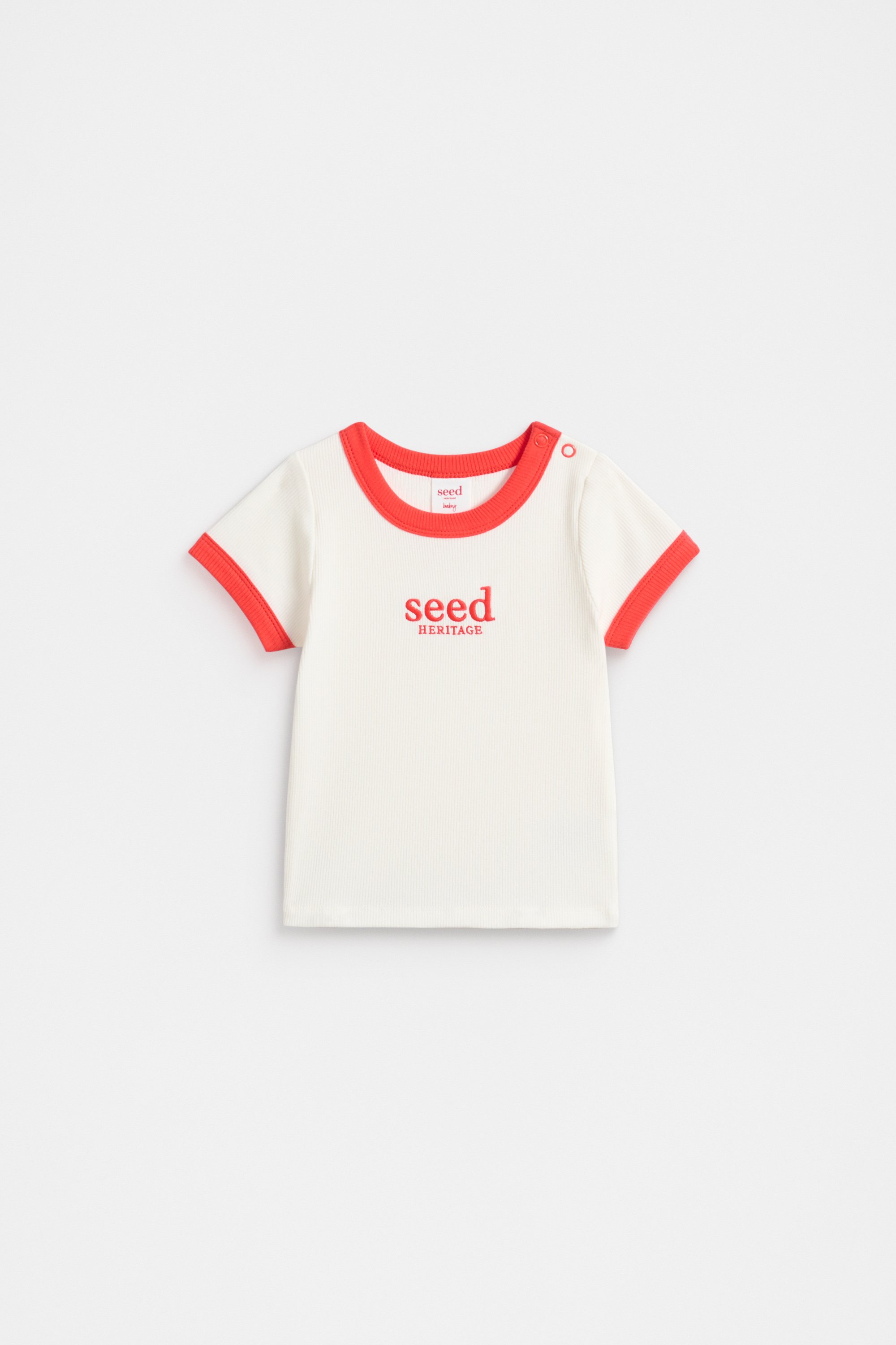 A comfortable essential, this tee is perfect for day to day wear. Crafted in a cotton rich blend with a little stretch, it features contrast trims, a round neck, short sleeves and an embroidered Seed Heritage logo. It has snaps at the shoulder for quick and easy changes.