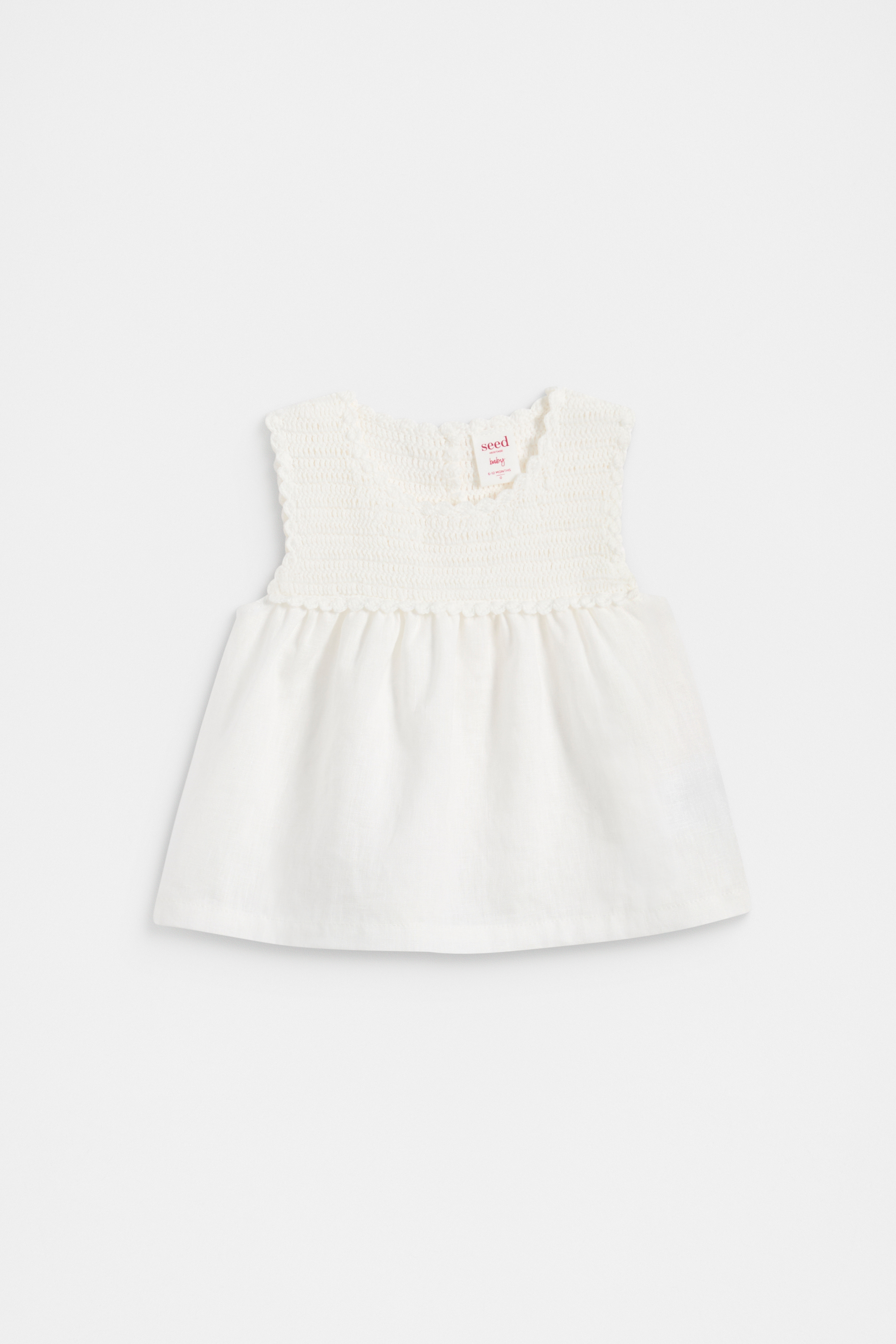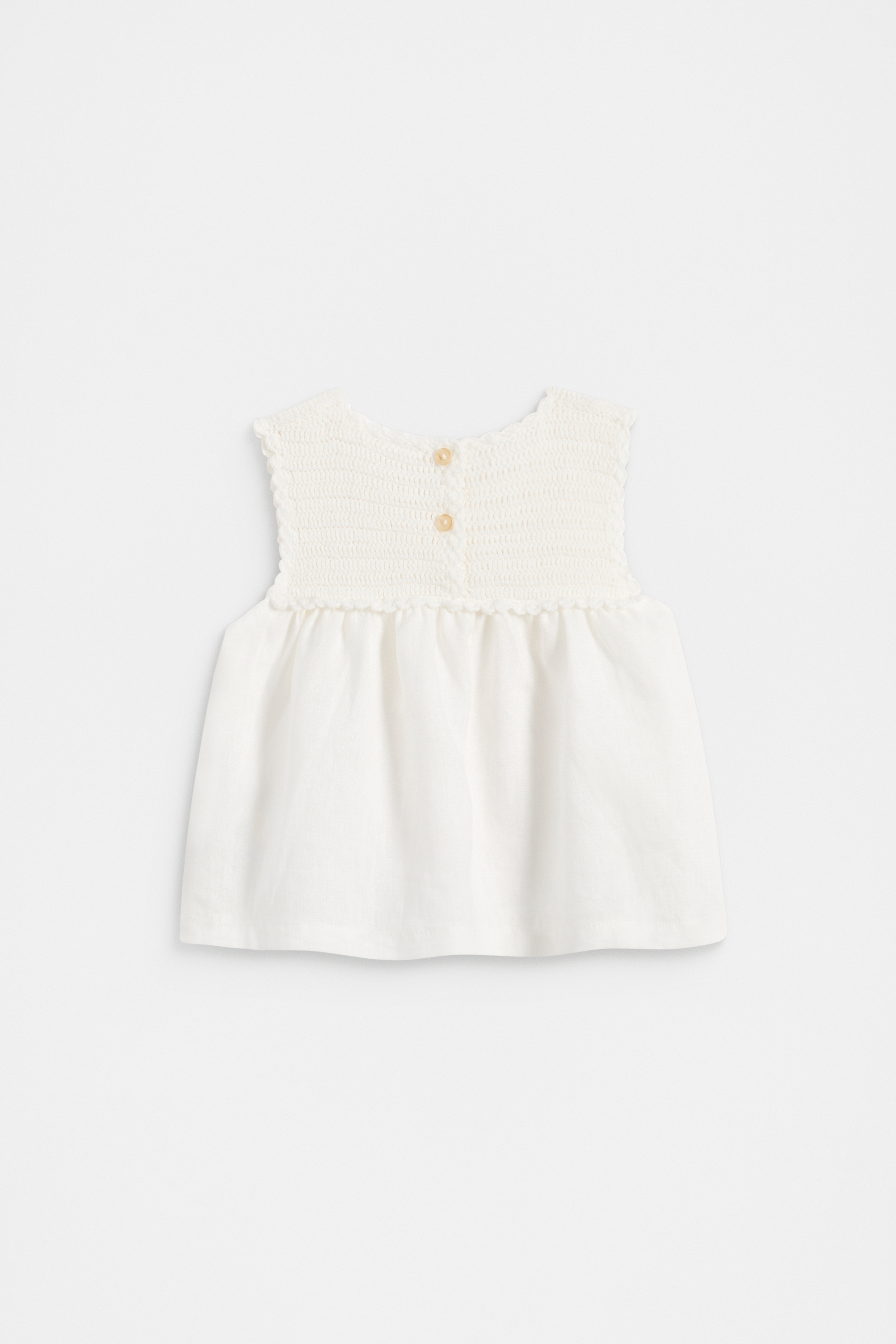 Ideal for the warmer months, this is the sweetest little top. It features a crochet yoke, a round neck with a rear button placket, and gathered details. Crafted from linen and cotton, it can be paired with the matching linen bloomers for a cute set.