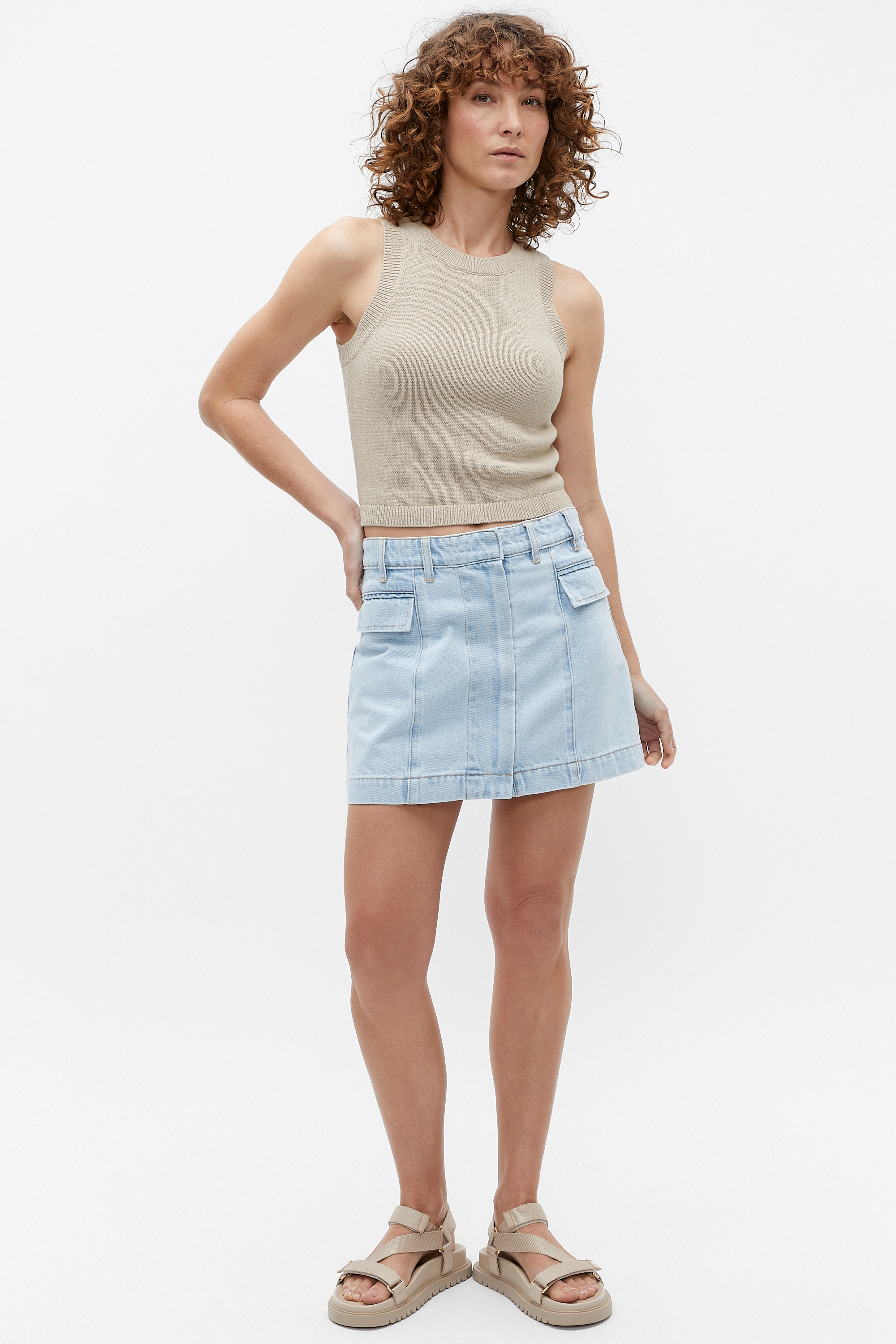 On-trend and crafted from classic rigid denim, this micro mini skirt is sure to slot right into your wardrobe. It features a fixed waistband with belt loops, a tab closure, a full-length zip, and duo utility pockets. By choosing our cotton products you're supporting our investment in Better Cotton's mission. This product was sourced via a system of mass balance and therefore may not contain Better Cotton.
