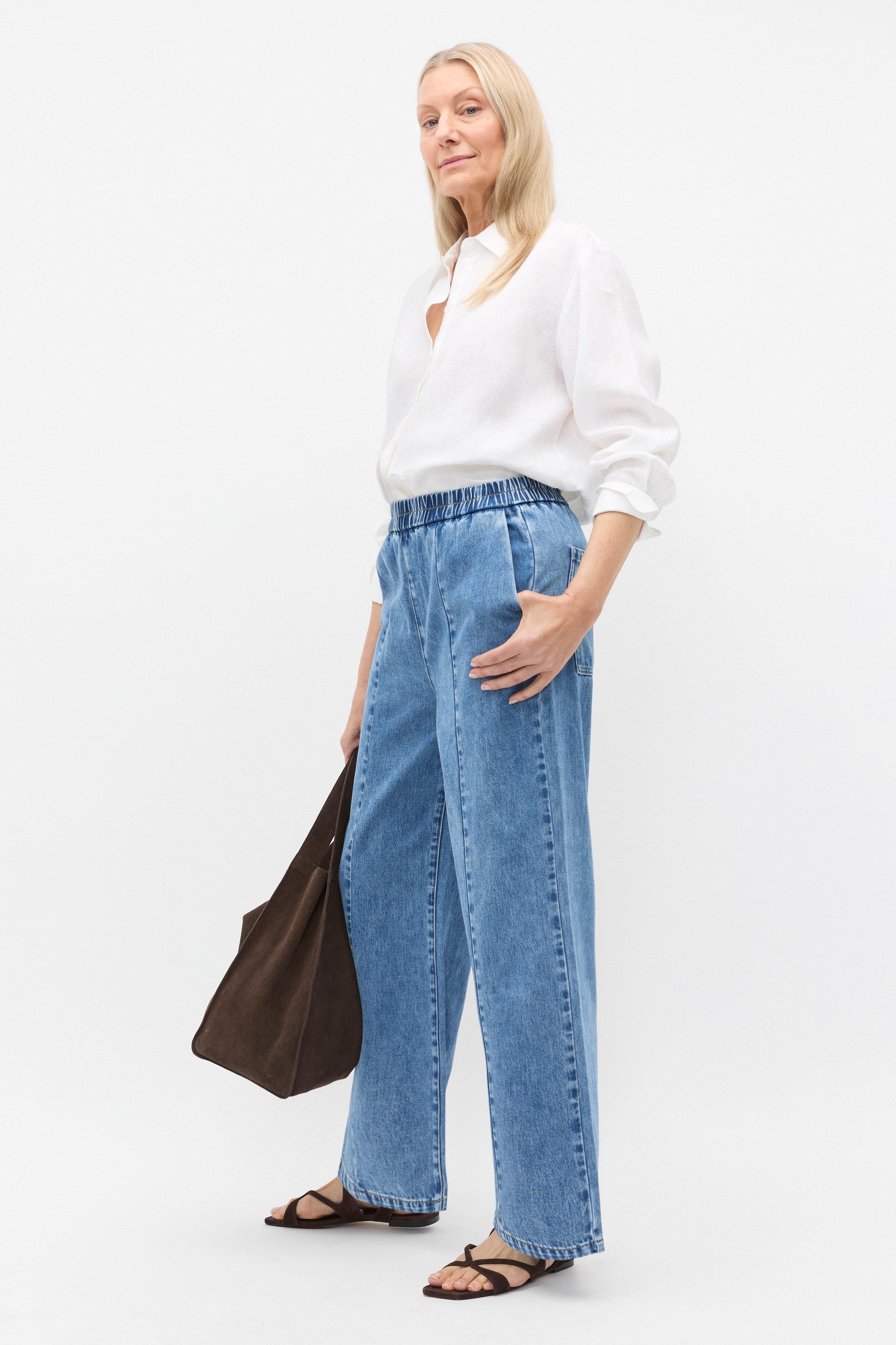 Comfortably chic, these pull-on jeans are a handy addition to your everyday styling. Crafted in premium cotton, they feature an elasticated waistband, pockets and a wide leg shape. By choosing our cotton products you're supporting our investment in Better Cotton's mission. This product was sourced via a system of mass balance and therefore may not contain Better Cotton.