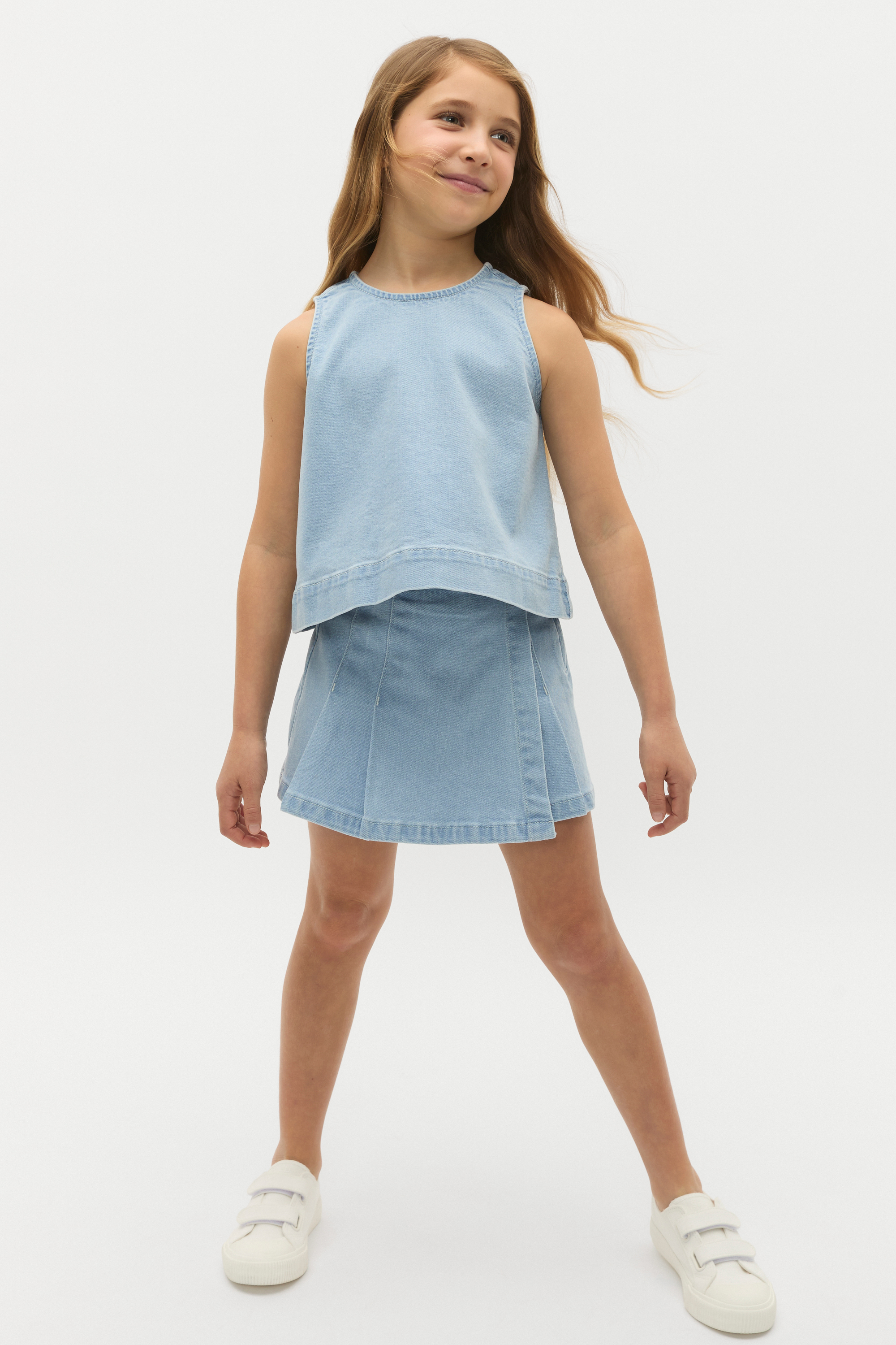 A new staple for her wardrobe, this swing top is crafted in a classic soft, non-stretch denim. With a sleeveless shape, it features a round neck and a slightly cropped length.