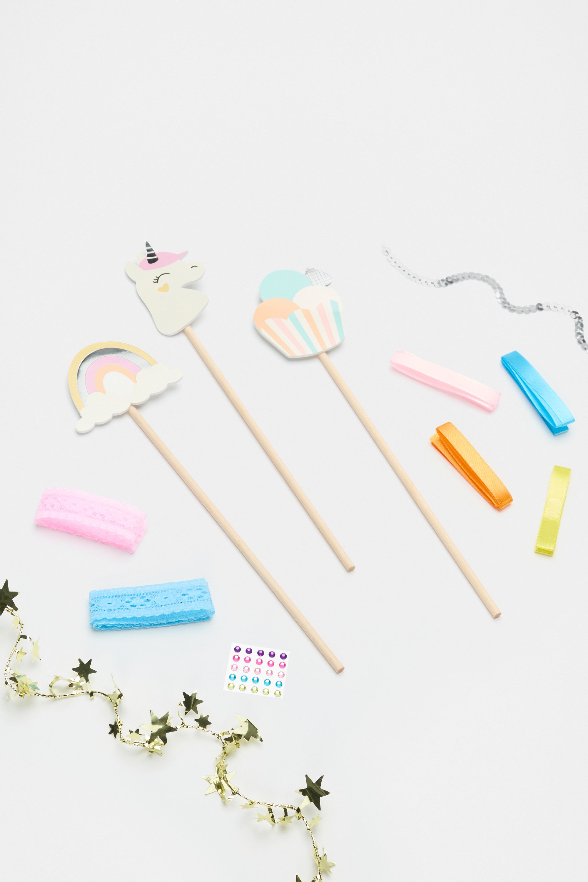 • Includes 3 wand toppers, 3 wooden sticks, ribbons, one sheet of gemstones and instruction sheet