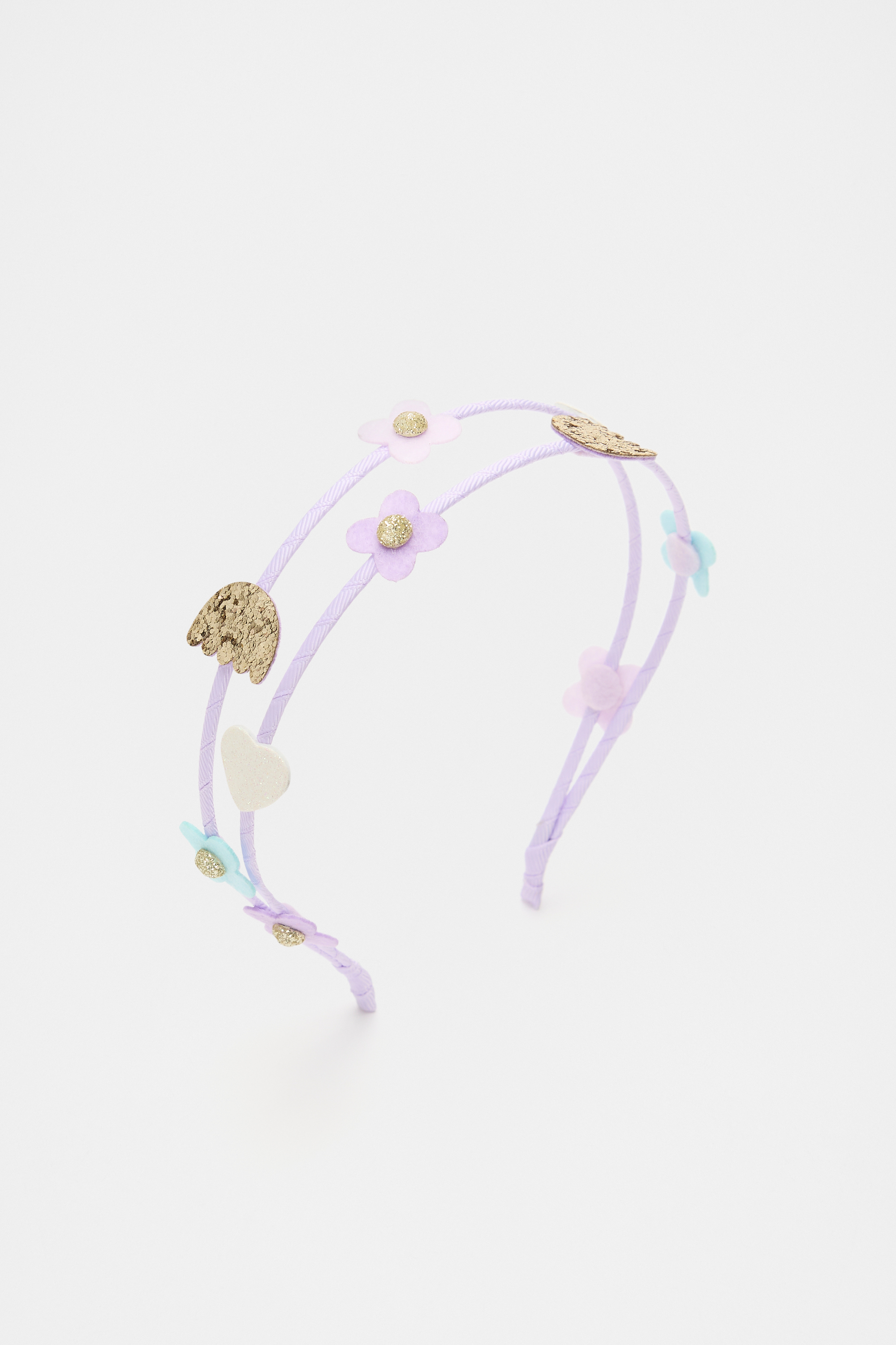 Cheerfully sweet with glittery details, this headband has a double band design with felt flowers and hearts. This product is not a toy and is not suitable for children three years and under.