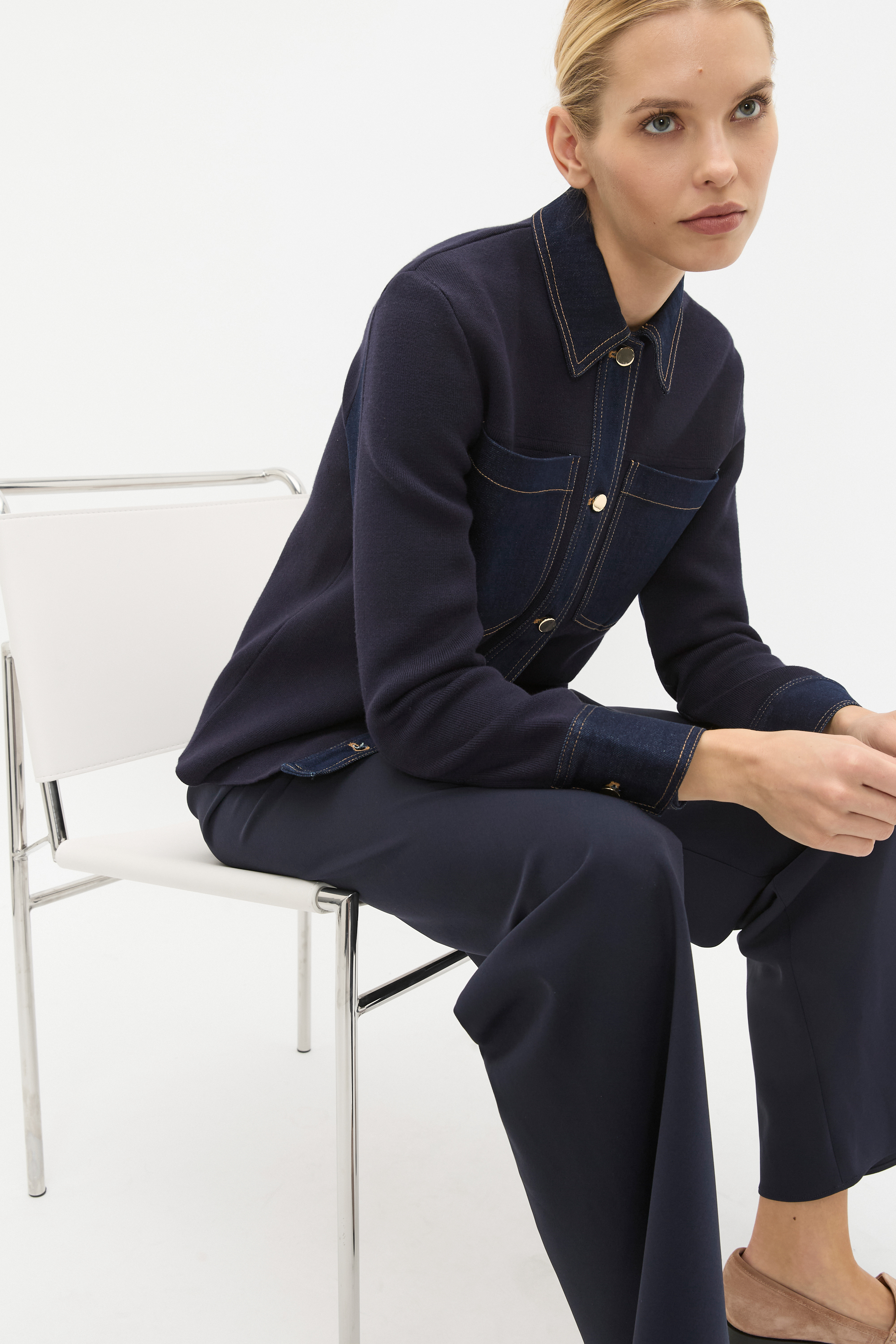 Adding texture to your wardrobe, this jacket is a contemporary play on a classic favourite. It's a soft knit style detailed with denim features including a denim collar, button-up placket, pockets and button cuffs. It also features contrast stitching for an on-trend finish.