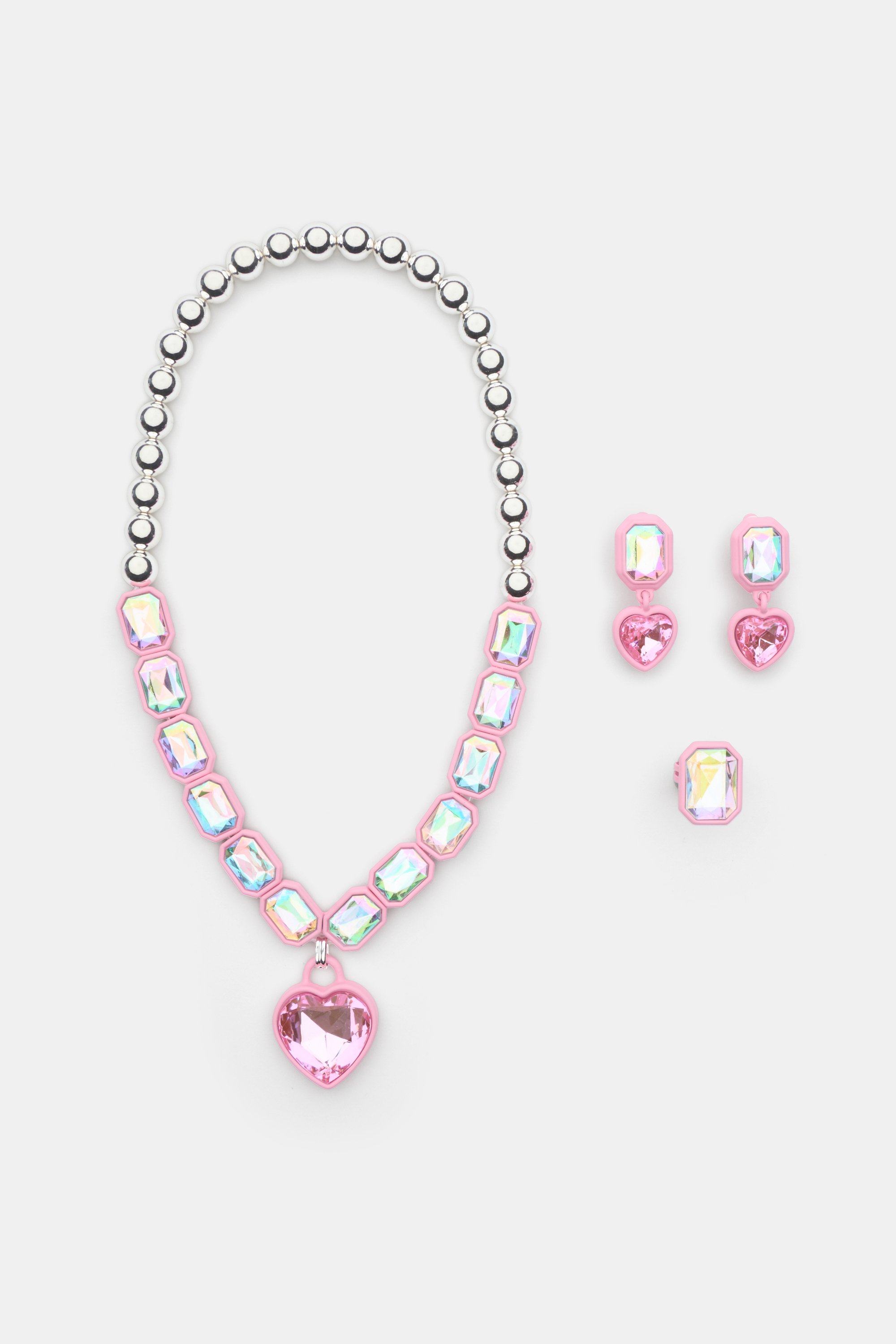 Sparkly and fun, this costume jewellery set includes clip-on earrings, an adjustable ring and a necklace, all with matching coloured gems. This product is not a toy and is not suitable for children three years and under.