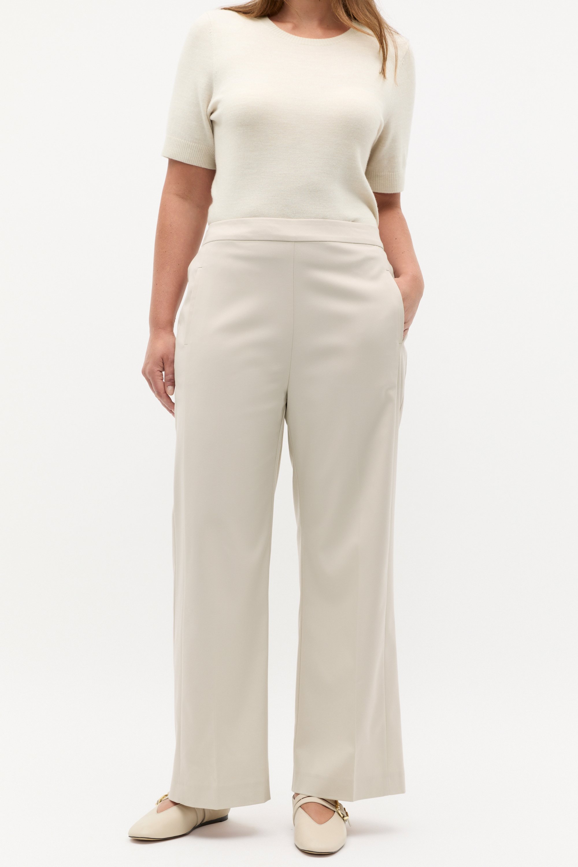 Versatile and classic, these pants will easily slot into your wardrobe. They feature a flat-front waistband with an elasticated back for comfort, faux pockets, crease details down the front, and a wide leg shape.