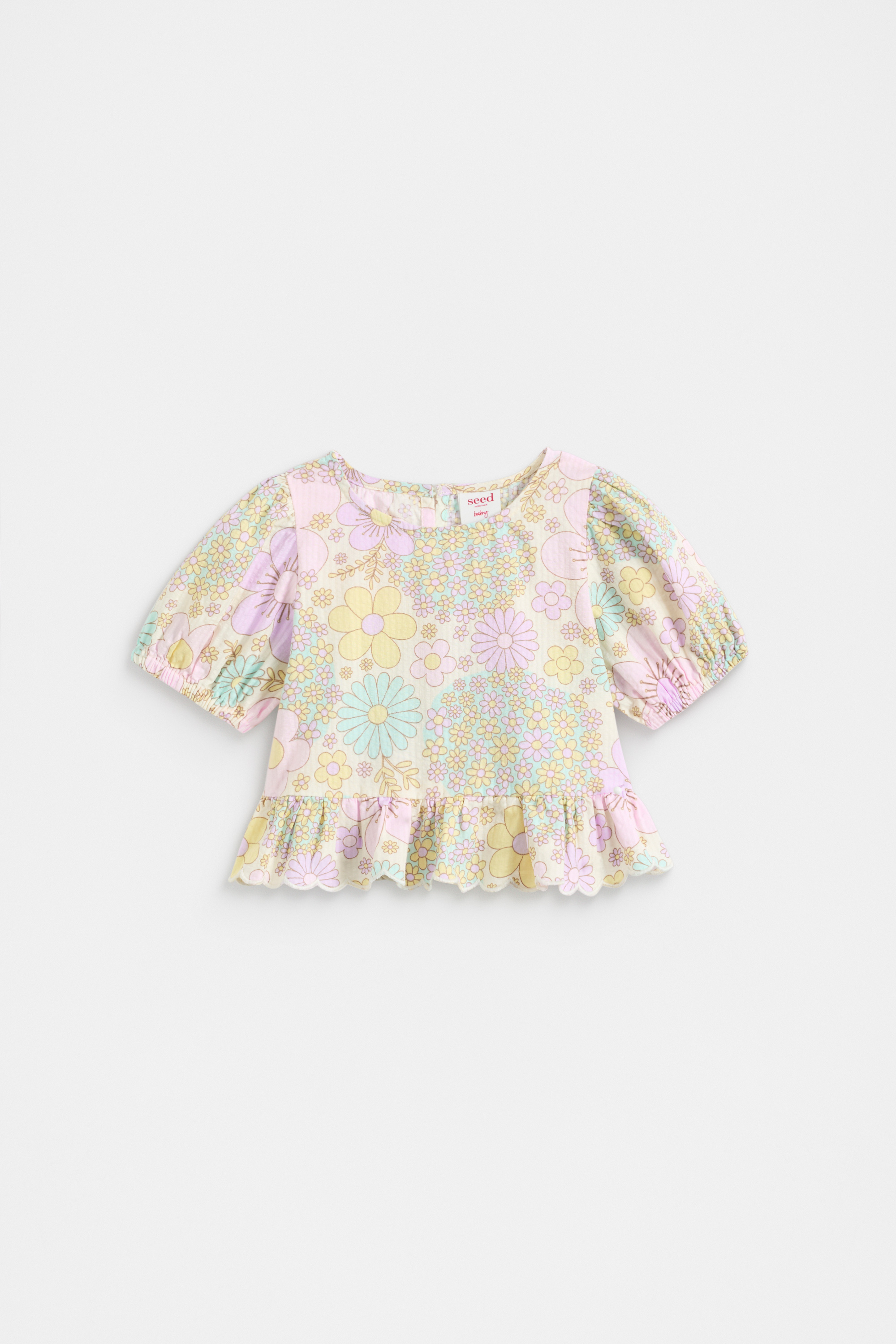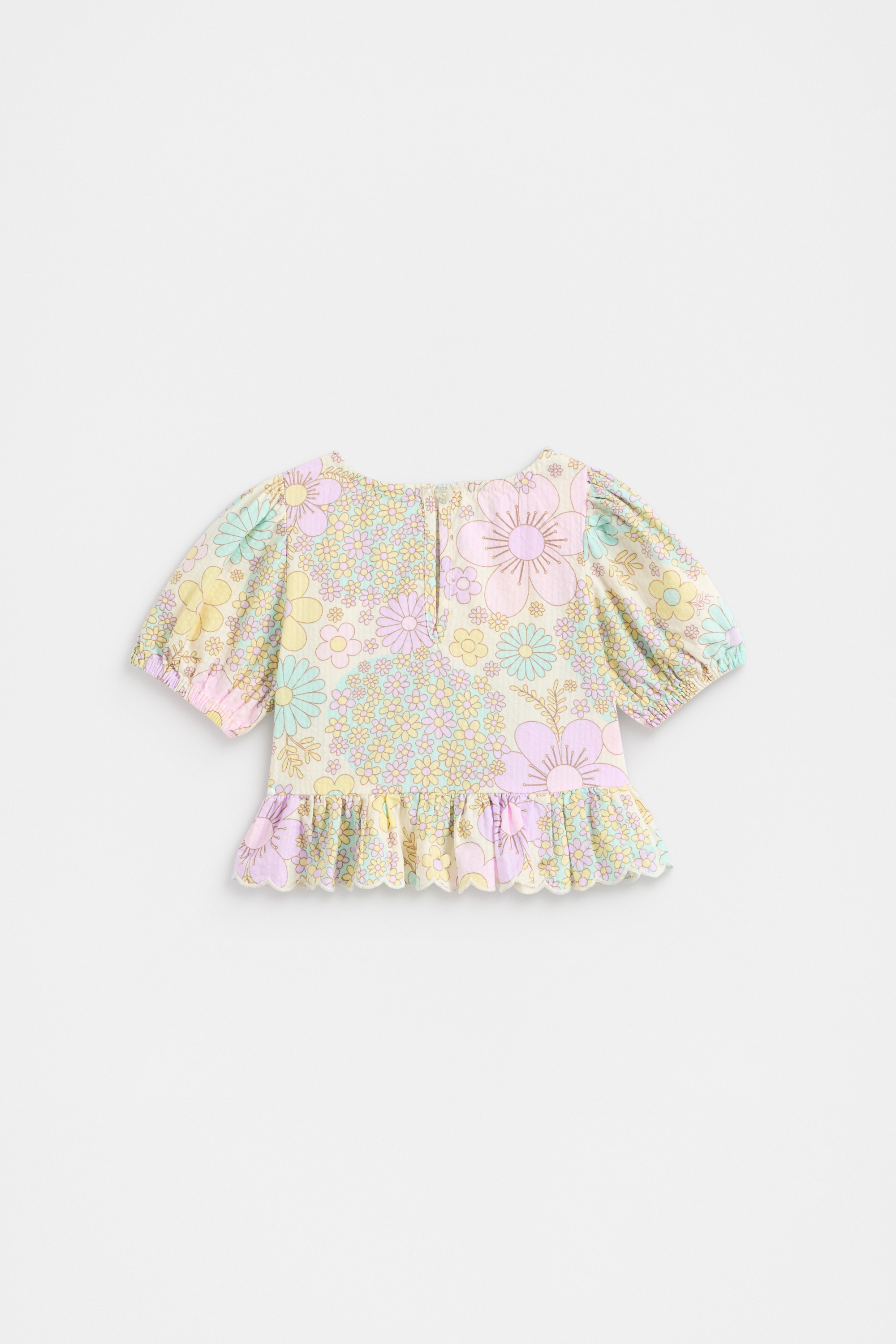 In our new sun-soaked floral print, this top adds a little vintage charm to her wardrobe. Crafted in premium cotton, it features a round neck, short puff sleeves, and a ruffle trim detail for added sweetness. Secures with a button at the back of the neck.