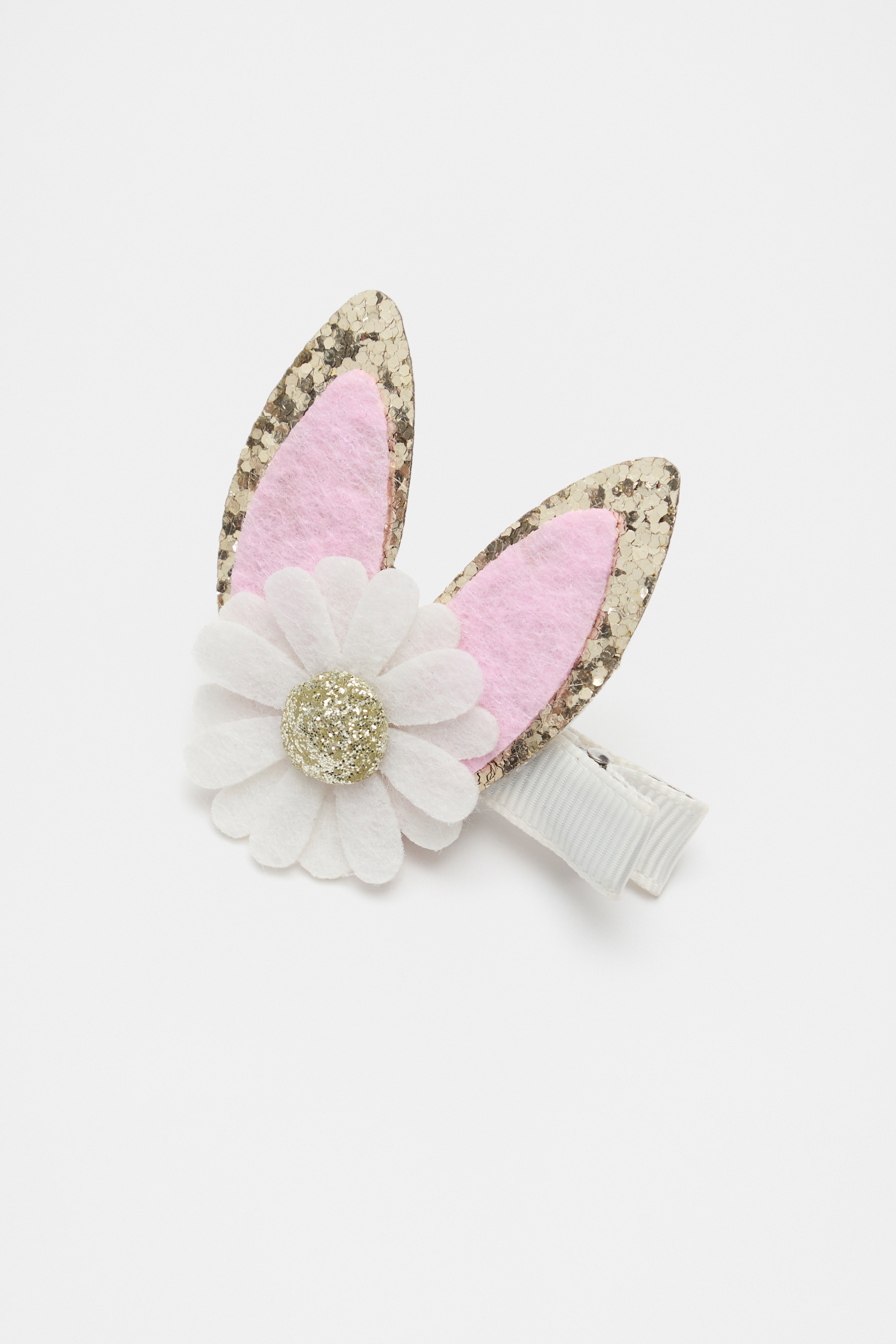 A sparkly design, this duck clip features bunny ears and a felt flower with glittery details. This product is not a toy and is not suitable for children three years and under.