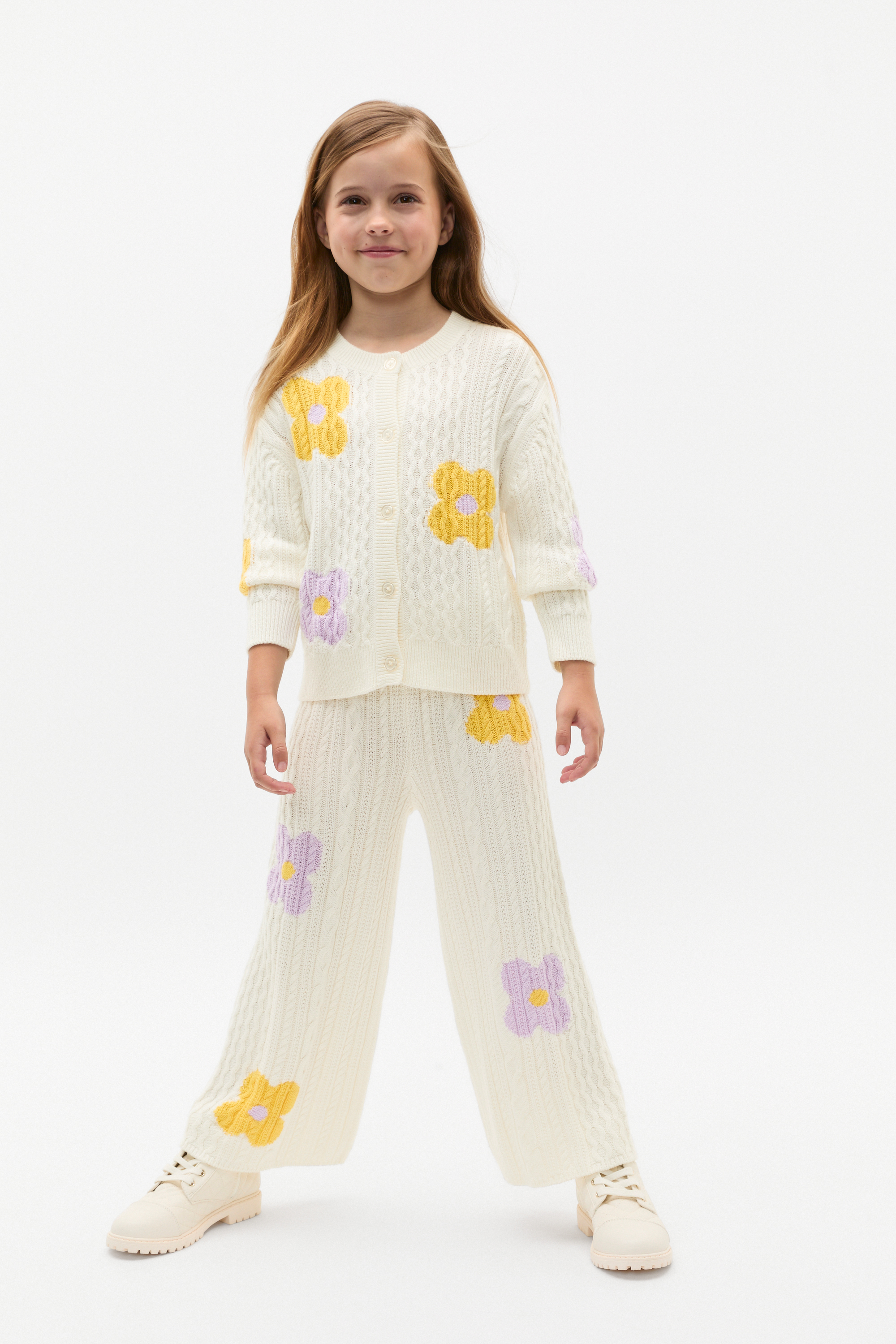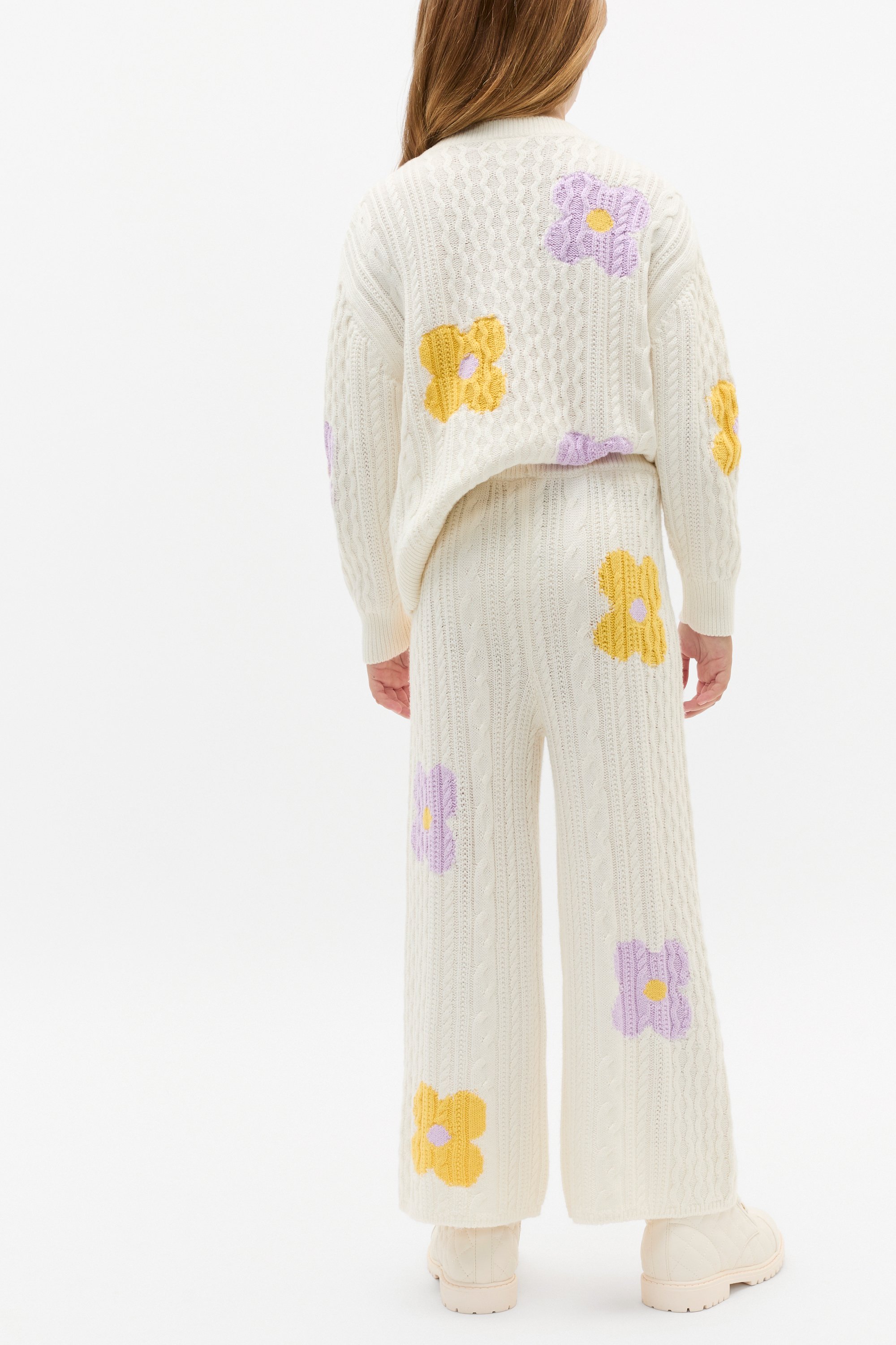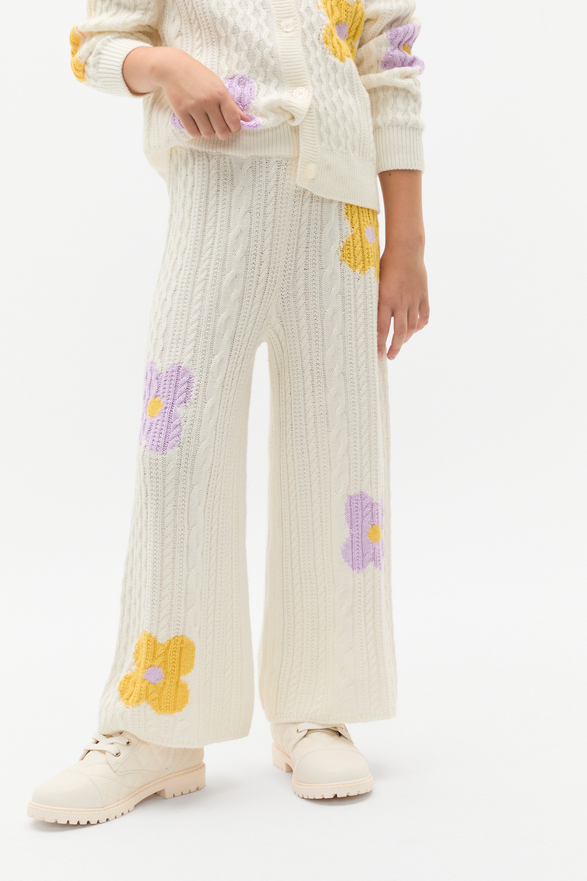Stretchy and sweet, these cable-knit pants are as comfortable as they are adorable. They feature an elasticated waistband and an all-over design of flowers. Style with the matching vest, cardigan or accessories for the cutest coordination.