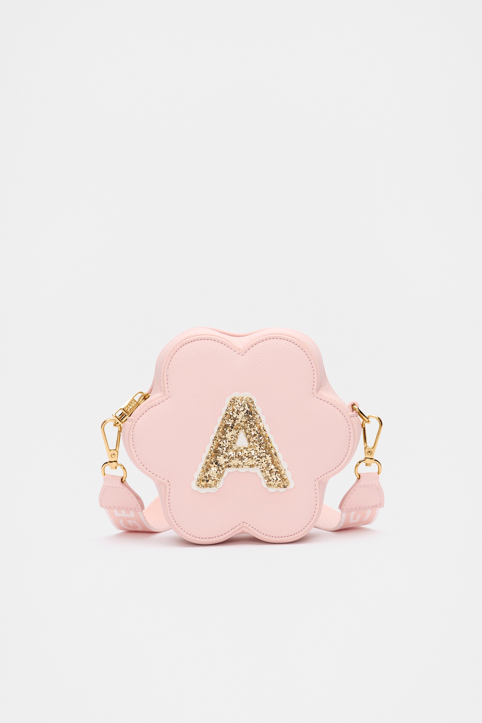 Stylish, fun, and personalised, this flower-shaped bag features a detachable crossbody strap with logo details, a top zip closure, gold-look hardware, and a glitter initial on the front. It also has a flower charm on the strap.