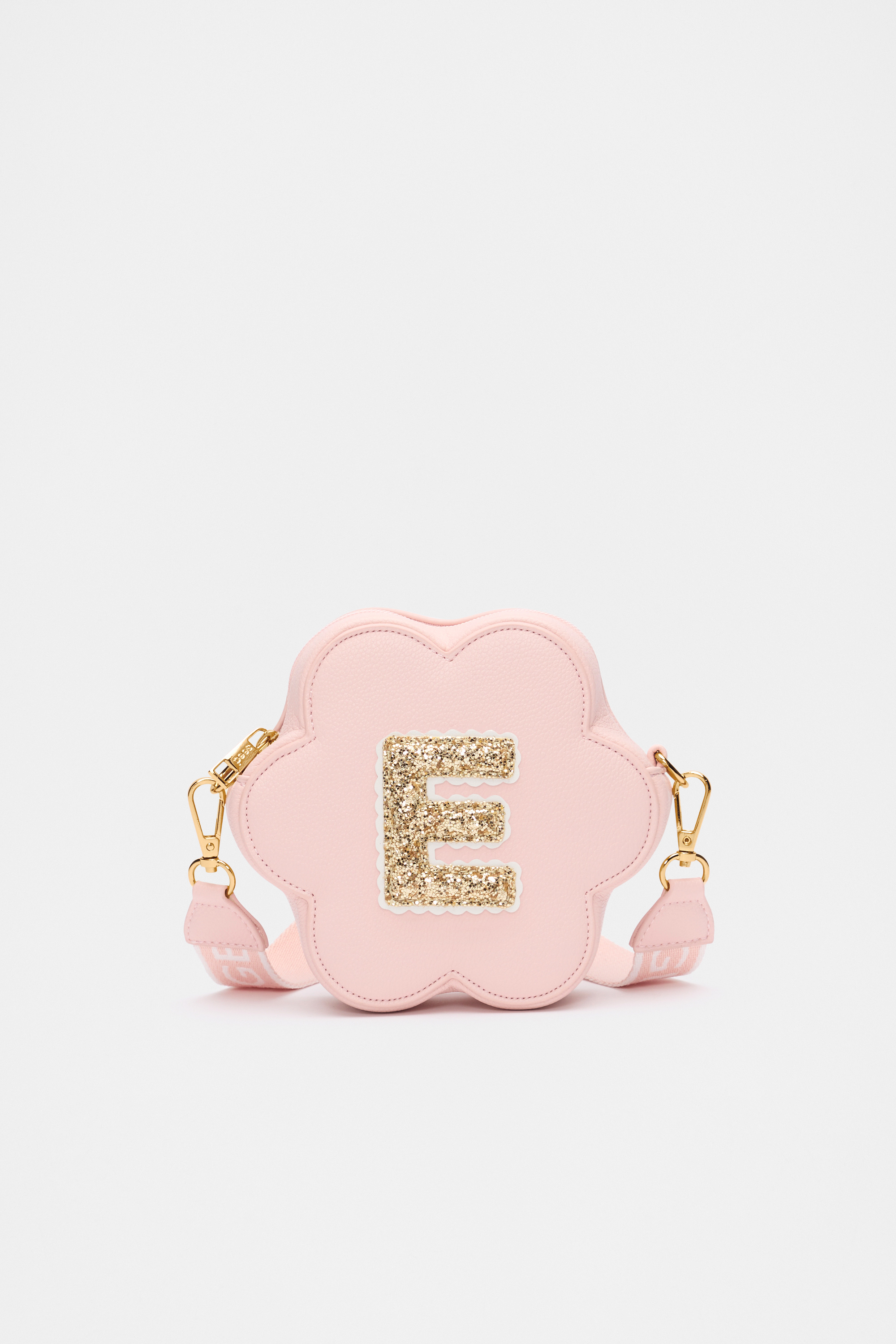 Stylish, fun, and personalised, this flower-shaped bag features a detachable crossbody strap with logo details, a top zip closure, gold-look hardware, and a glitter initial on the front. It also has a flower charm on the strap.