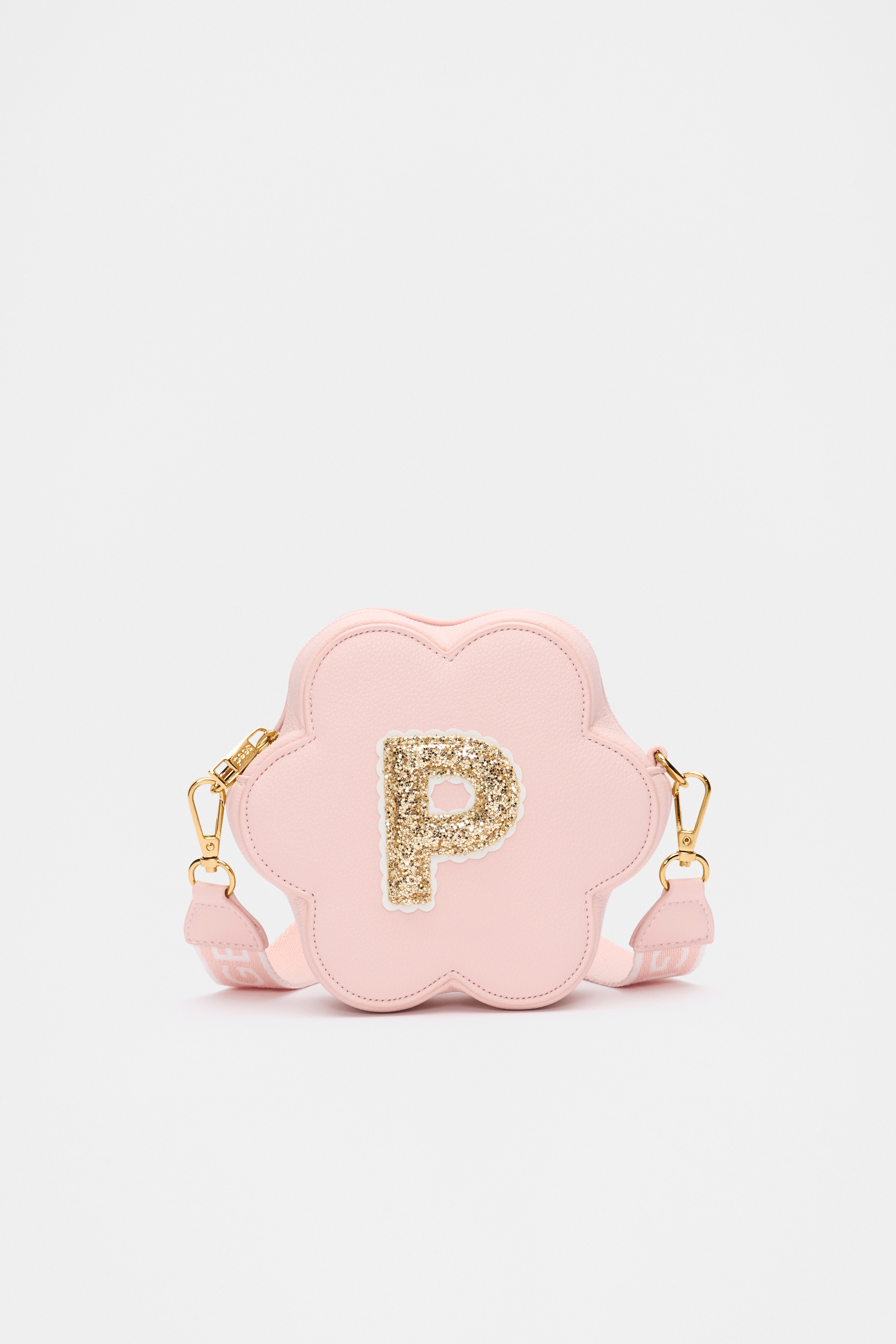 Stylish, fun, and personalised, this flower-shaped bag features a detachable crossbody strap with logo details, a top zip closure, gold-look hardware, and a glitter initial on the front. It also has a flower charm on the strap.