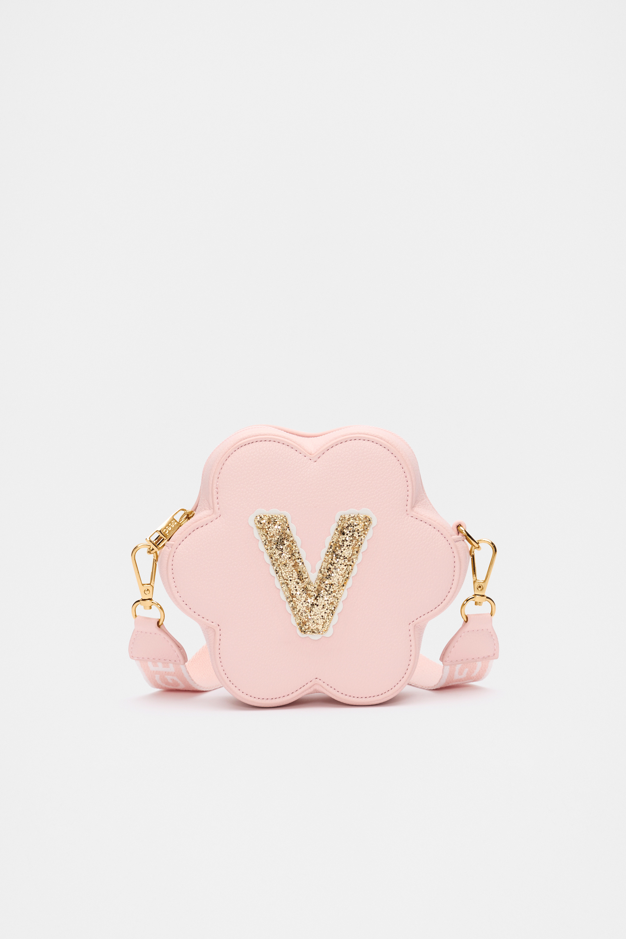 Stylish, fun, and personalised, this flower-shaped bag features a detachable crossbody strap with logo details, a top zip closure, gold-look hardware, and a glitter initial on the front. It also has a flower charm on the strap.