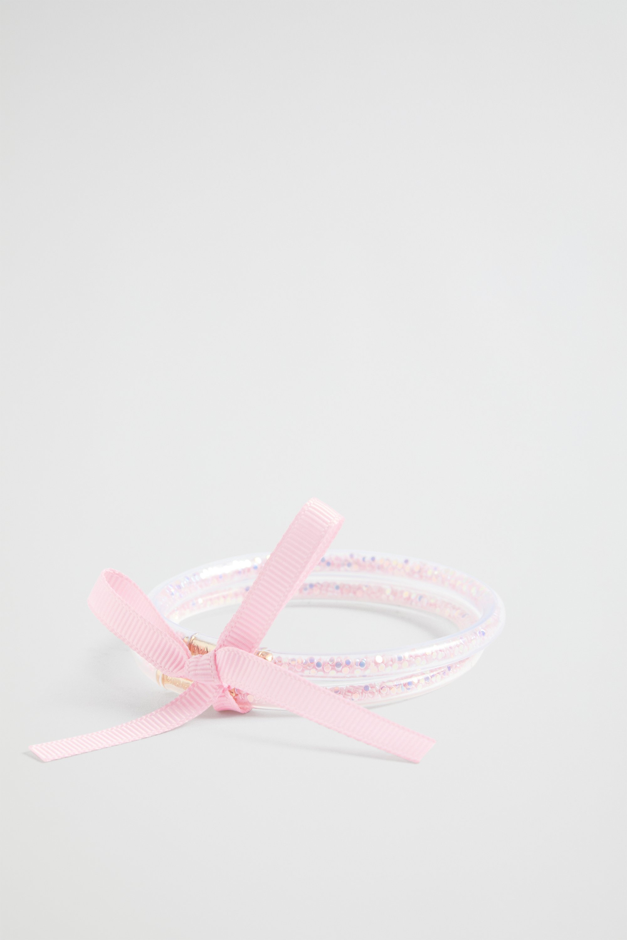 Add a touch of sparkling fun to any outfit with these glitter bangles, featuring a grosgrain ribbon tie and a gold-look detail. They come in a handy set of two. This product is not a toy and is not suitable for children three years and under.