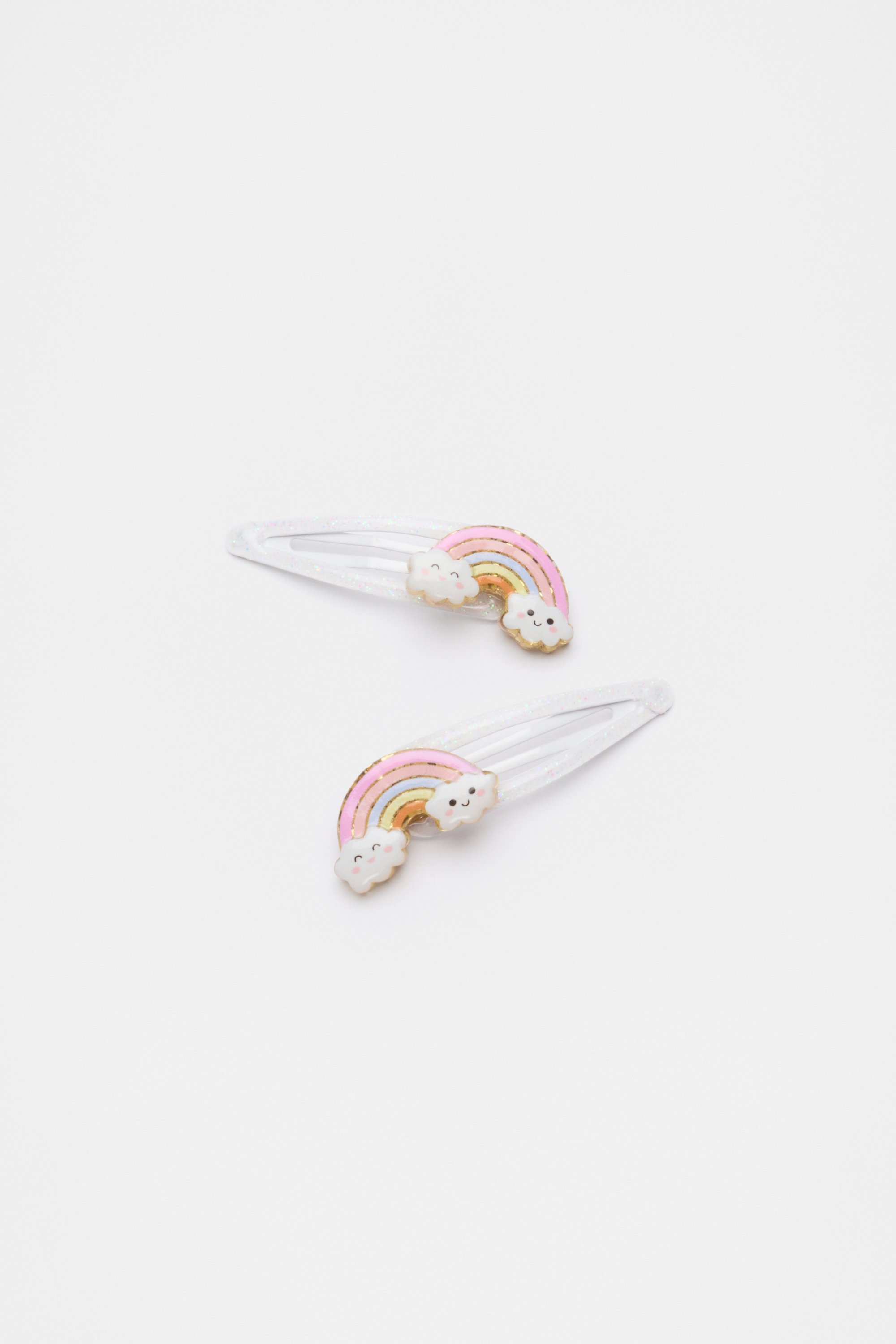 Bright and cheerful, these hair snaps have a glittery finish and feature smiling rainbows. This product is not a toy and is not suitable for children three years and under.