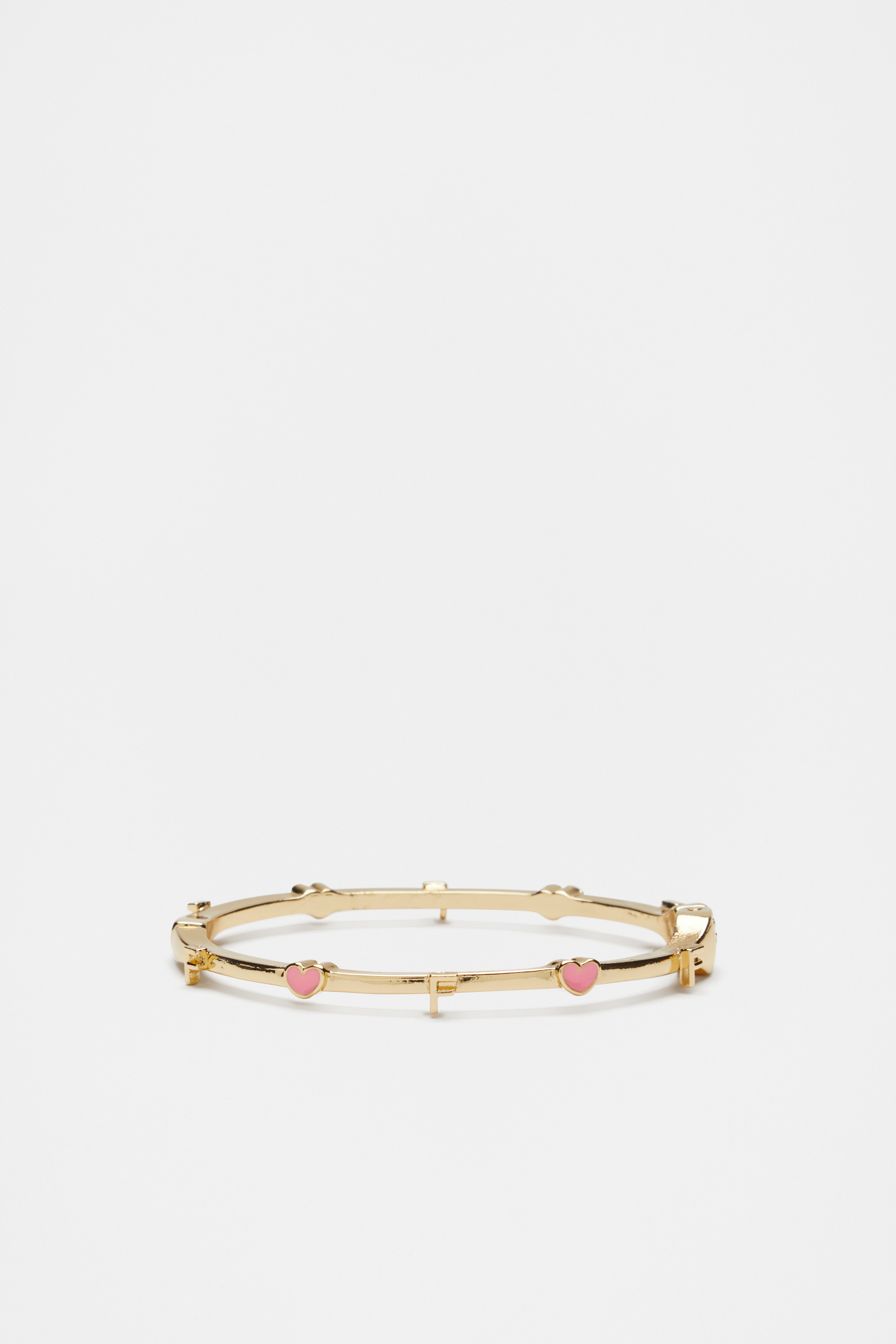Add a bit of shine and personality to their look with this hinge bangle, featuring a gold-look finish and a pattern of hearts and an initial letter. This product is not a toy and is not suitable for children three years and under.