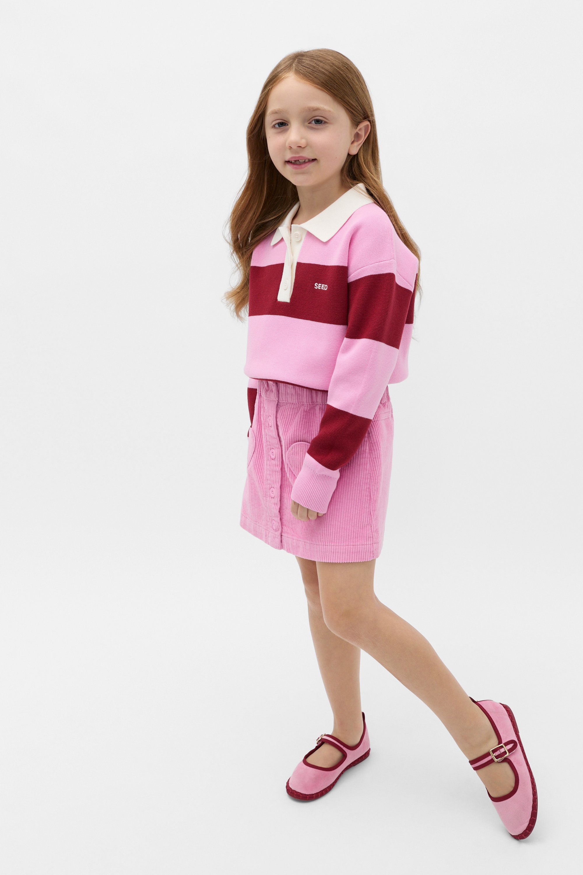This knit jumper is a classic rugby style, and a comfortable layer for her wardrobe. Crafted in premium cotton with a soft knit finish, it features a bold stripe design as well as a contrast collar with a button placket and ribbed detailing at the trims.
