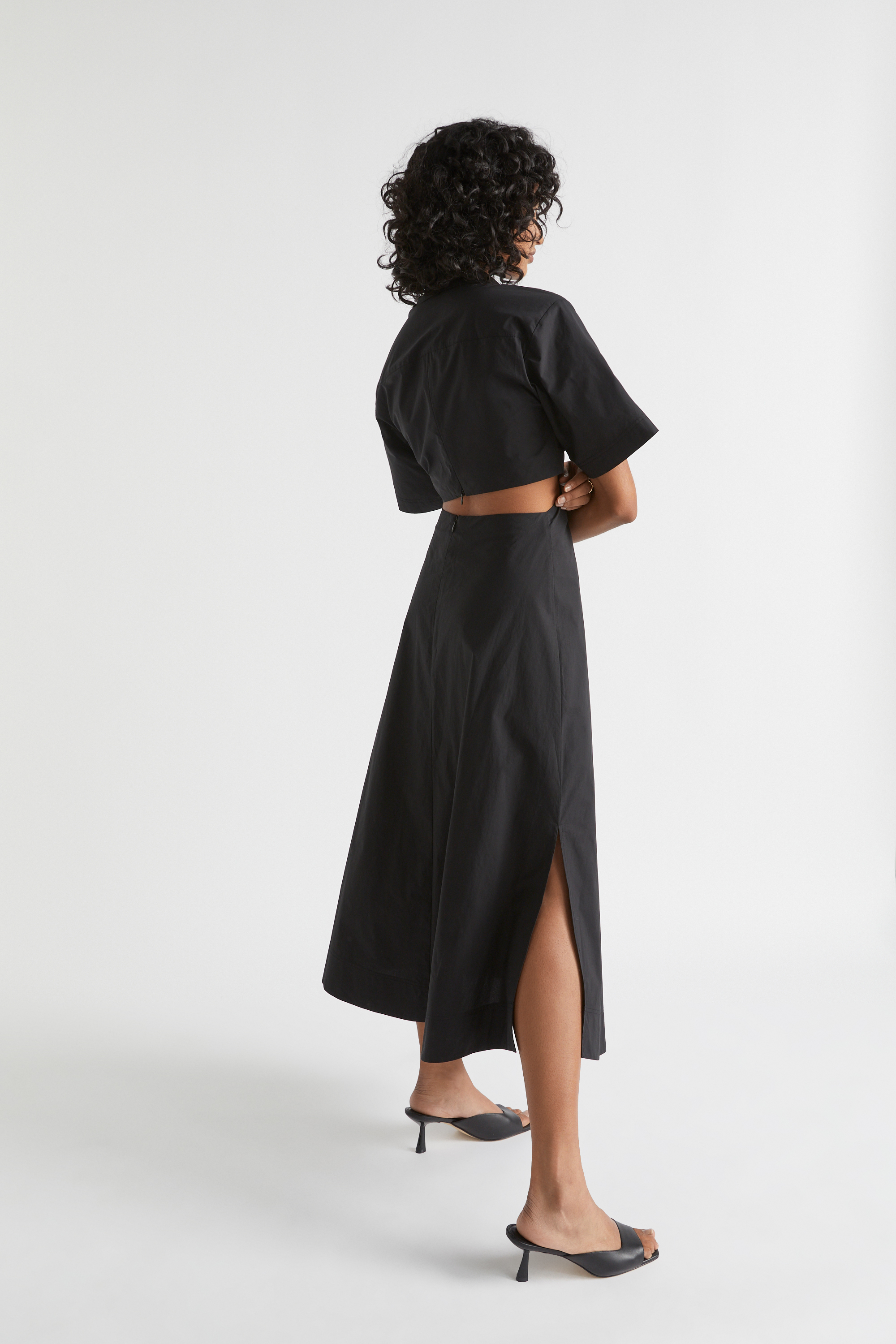 This shirt dress has a modern feel thanks to its waist cutouts. A voluminous maxi skirt provides balance, while the smooth cotton poplin fabric ensures comfort. By choosing our cotton products, you are supporting our investment in the Better Cotton mission.