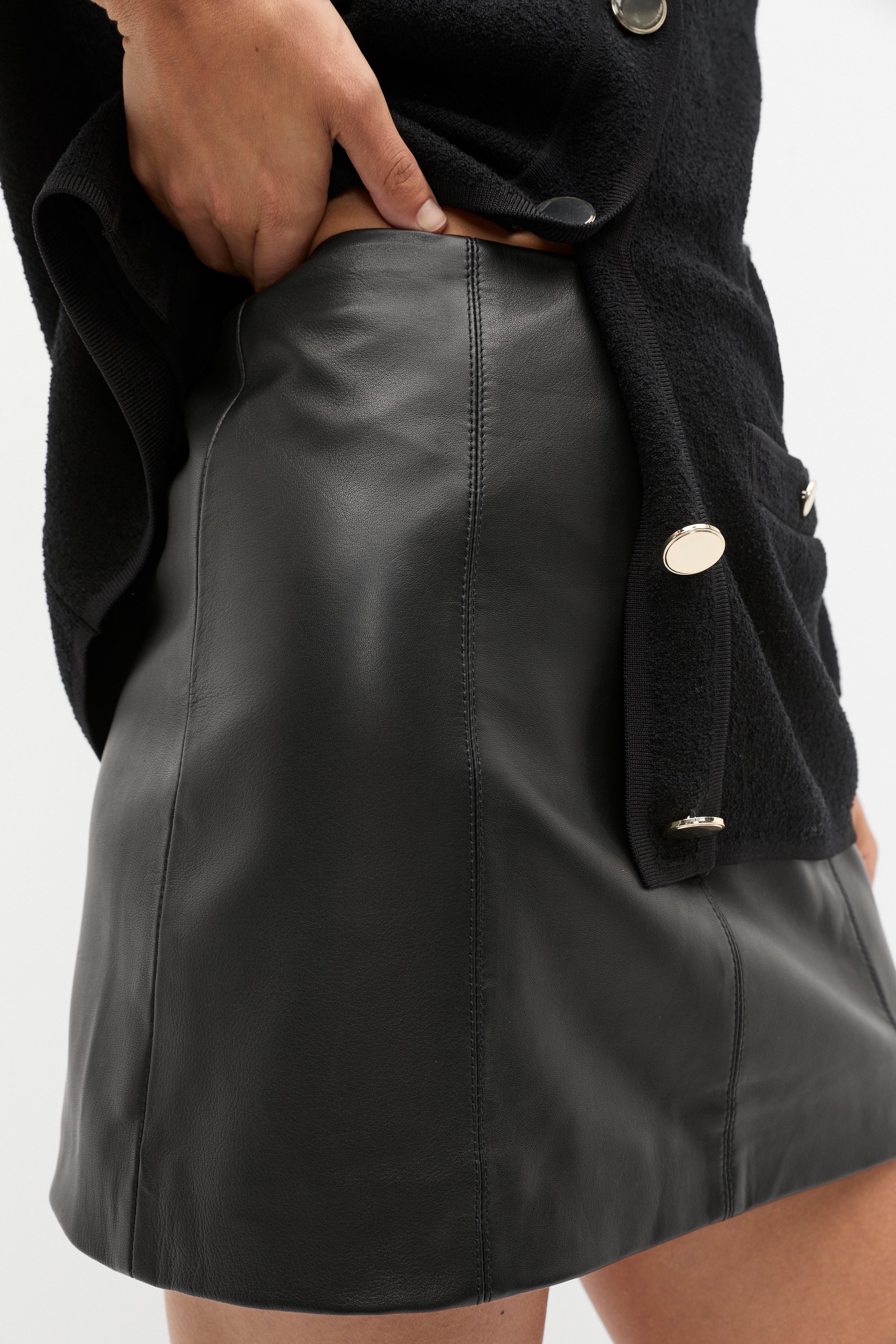 All in leather for a fashion-forward finish, this skirt is set to be your new favourite style. In a mini length, it features a fixed waistband with a rear zip and a panelled construction. As a proud member of Leather Working Group, Seed supports their mission of greater transparency and continuous improvement, helping to create more responsible leather production. For more information, please visit Leather Working Group.