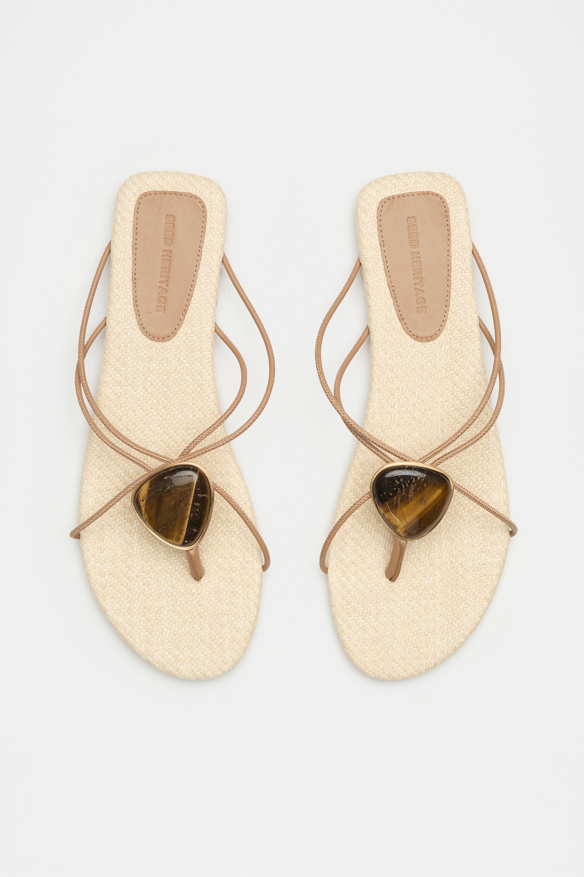 With a simple, elevated design, these sandals are the perfect pair for your summer wardrobe. They're detailed with a semi-precious tigers eye stone to add a little something extra to your look. As a proud member of Leather Working Group, Seed supports their mission of greater transparency and continuous improvement, helping to create more responsible leather production. For more information, please visit Leather Working Group.