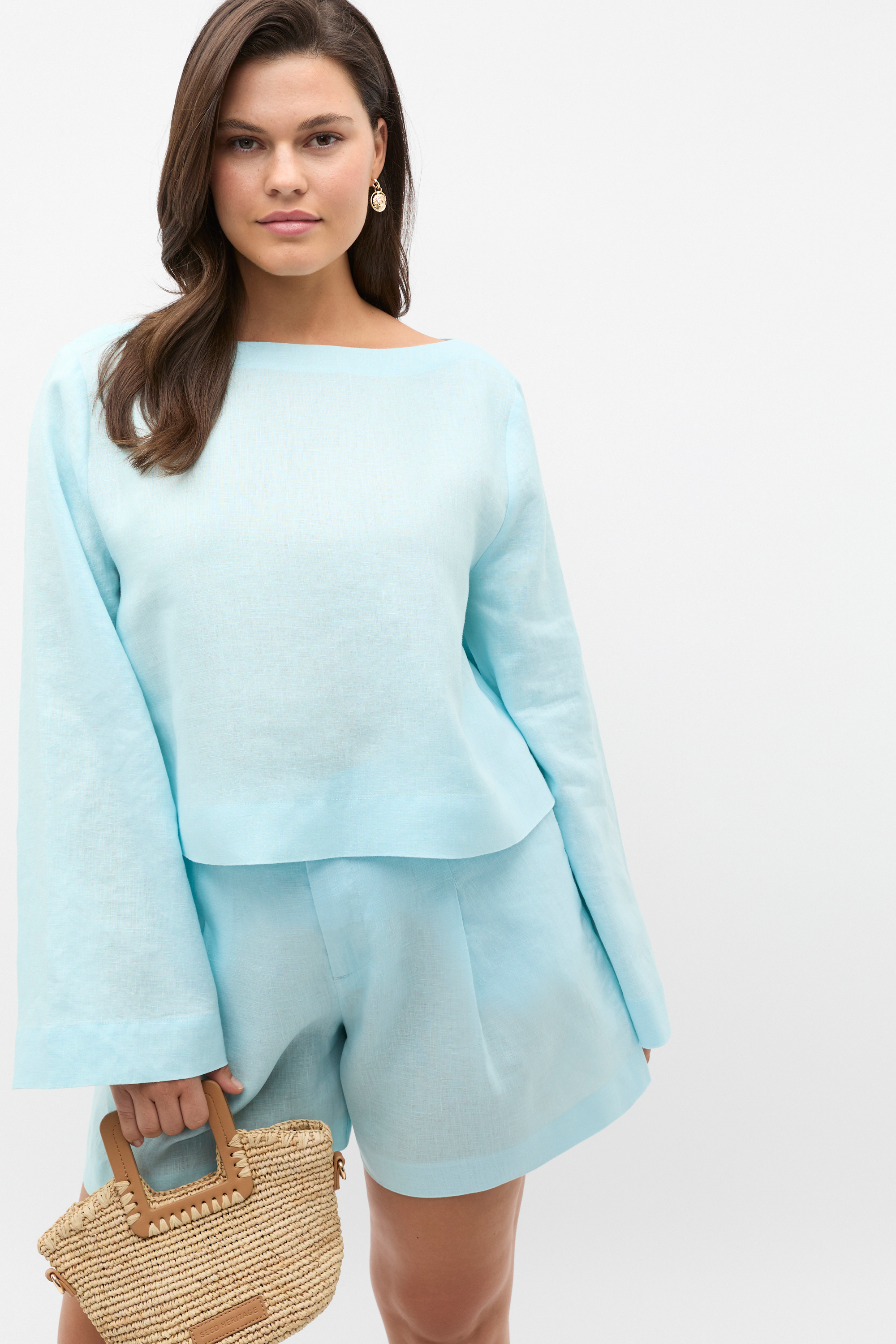Effortless and chic, this boat neck top is the ideal option for summer days. Crafted in premium linen, it features a boat neckline, long sleeves and a cropped length with a side split detail. Secures with a button at the back of the neck.