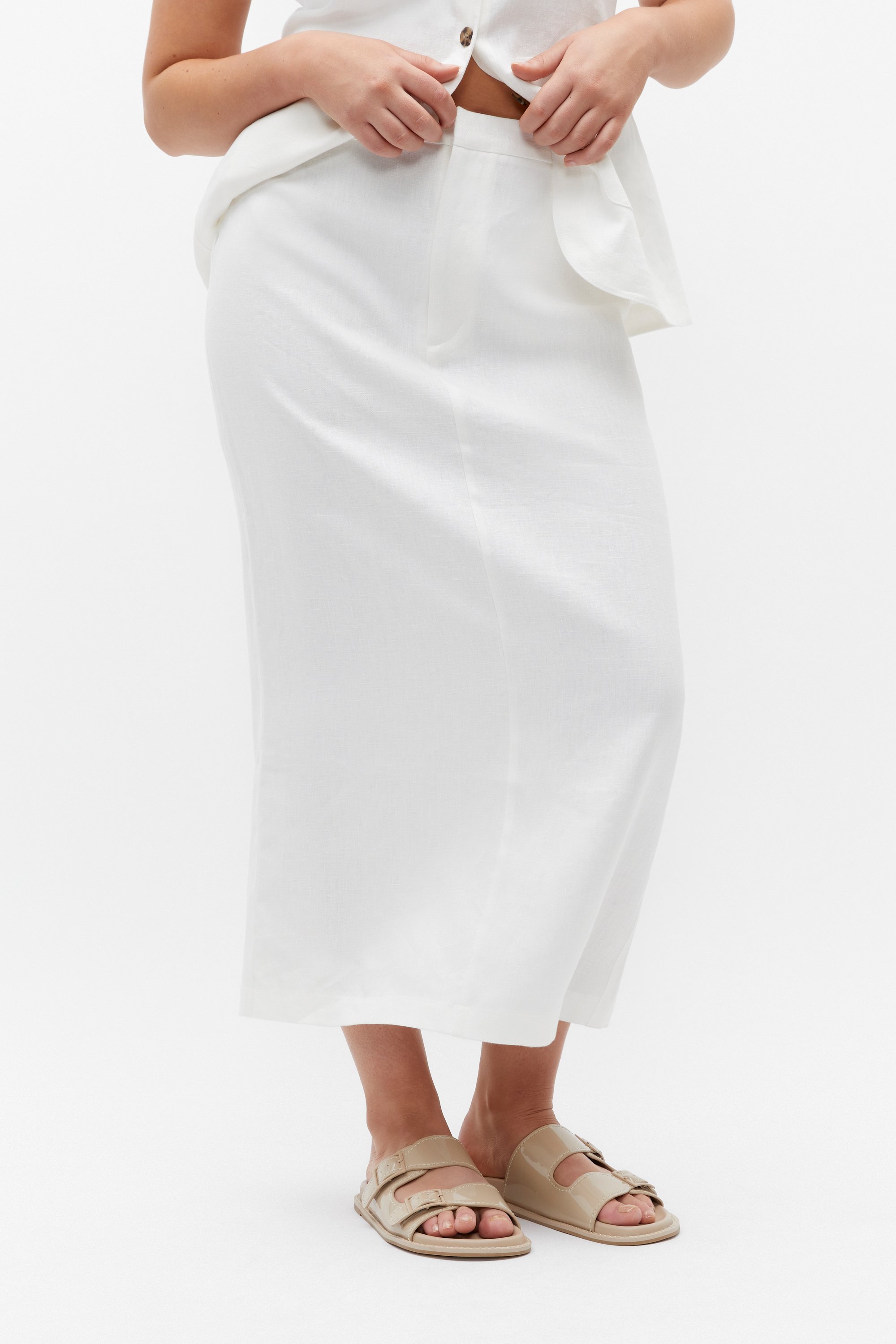 Crafted from premium linen made with French flax, this maxi skirt is set to be your new go-to. It features a fixed waistband with belt loops, and secures with a tab and zip closure, along with an internal button. With a straight fit, it also has a rear hem split for movement.