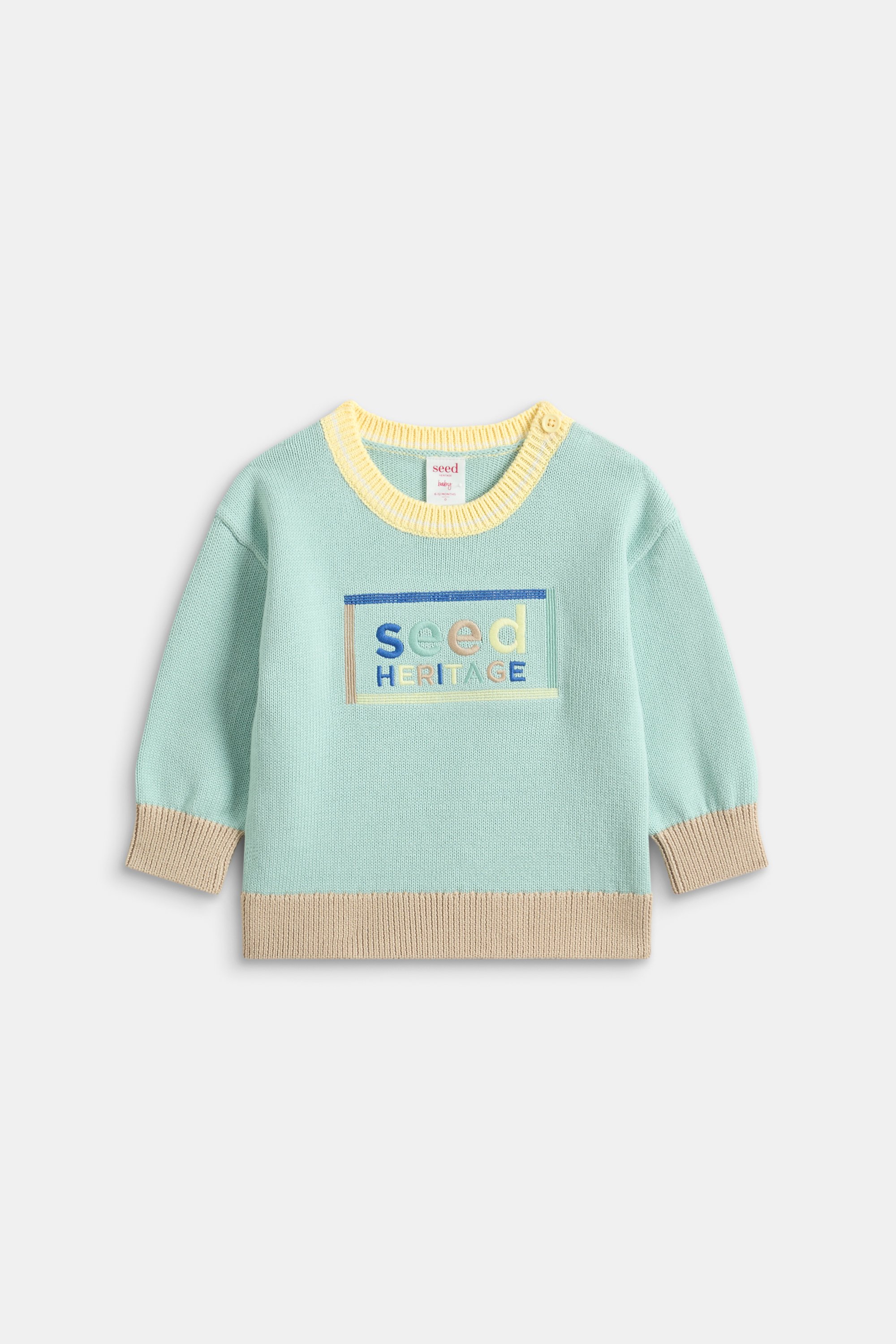 Add some colour and fun to his everyday wardrobe with this adorable retro sweater. Crafted in premium cotton with a soft knit finish, it features a round neck with a contrast collar, long sleeves and a colourful embroidered Seed Heritage logo.