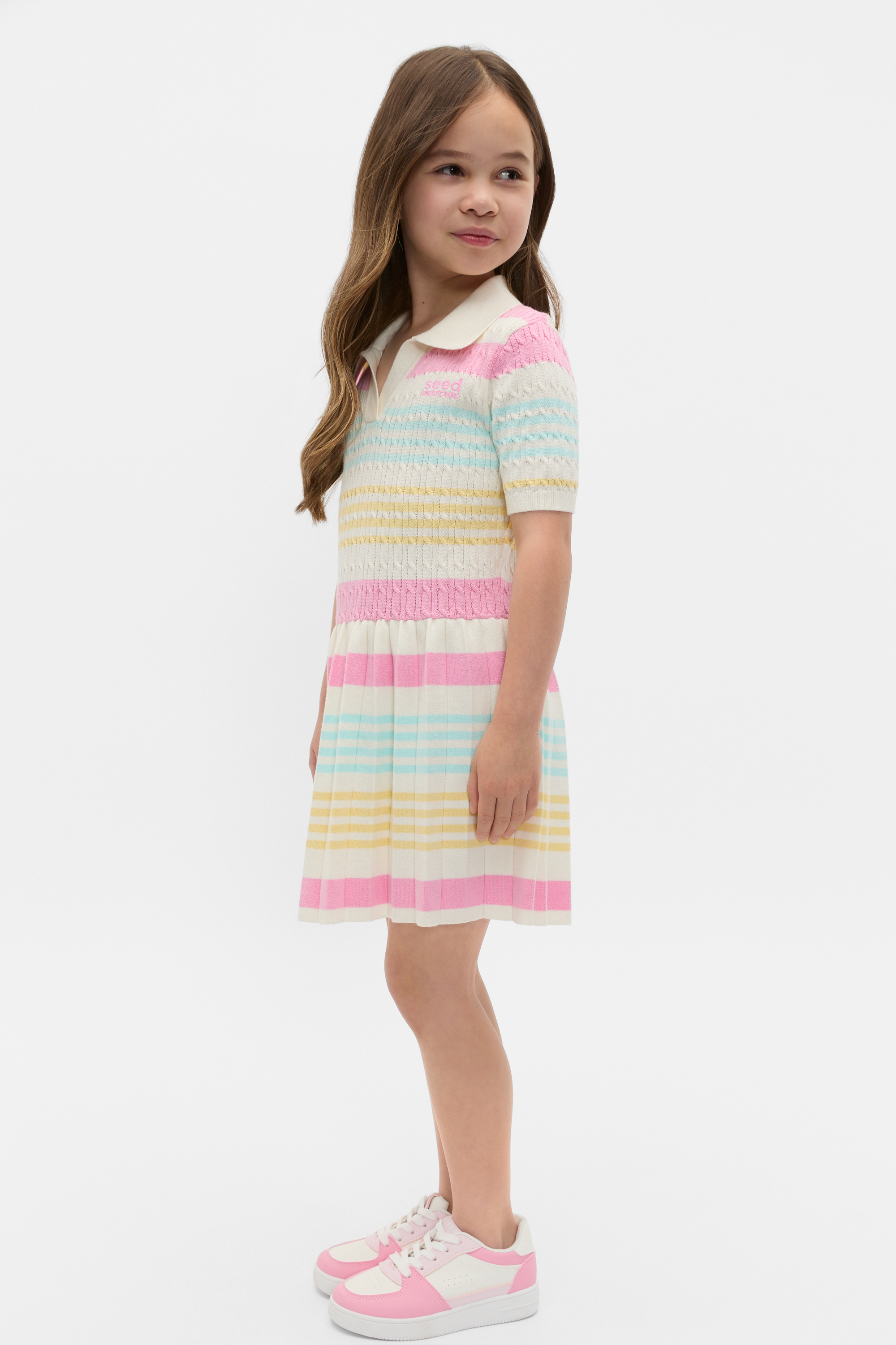 So sweet and stylish, this knit dress is a statement option, perfect for parties and summer occasions. Crafted in premium cotton with a knit finish, it features a collar, short sleeves, a variegated stripe design in the prettiest pastels and a pleated skirt.