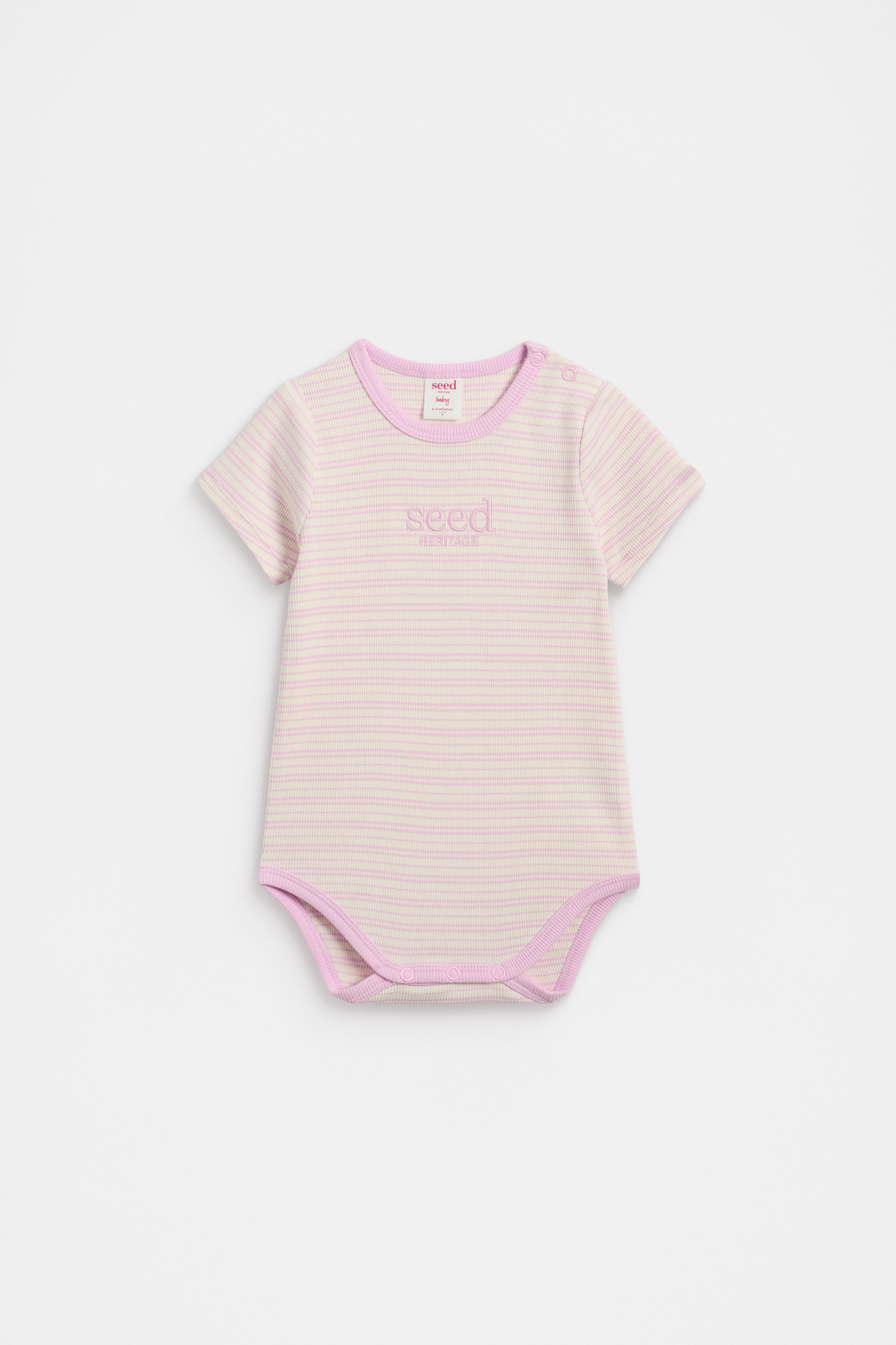 Made from an ultra-soft cotton blend with a rib finish and just the right amount of stretch, this is a must-have for any newborn. It's a short sleeve style with a round neck, a stripe design and an embroidered Seed Heritage logo. It fastens with snaps at the shoulder and gusset for quick and easy changes.