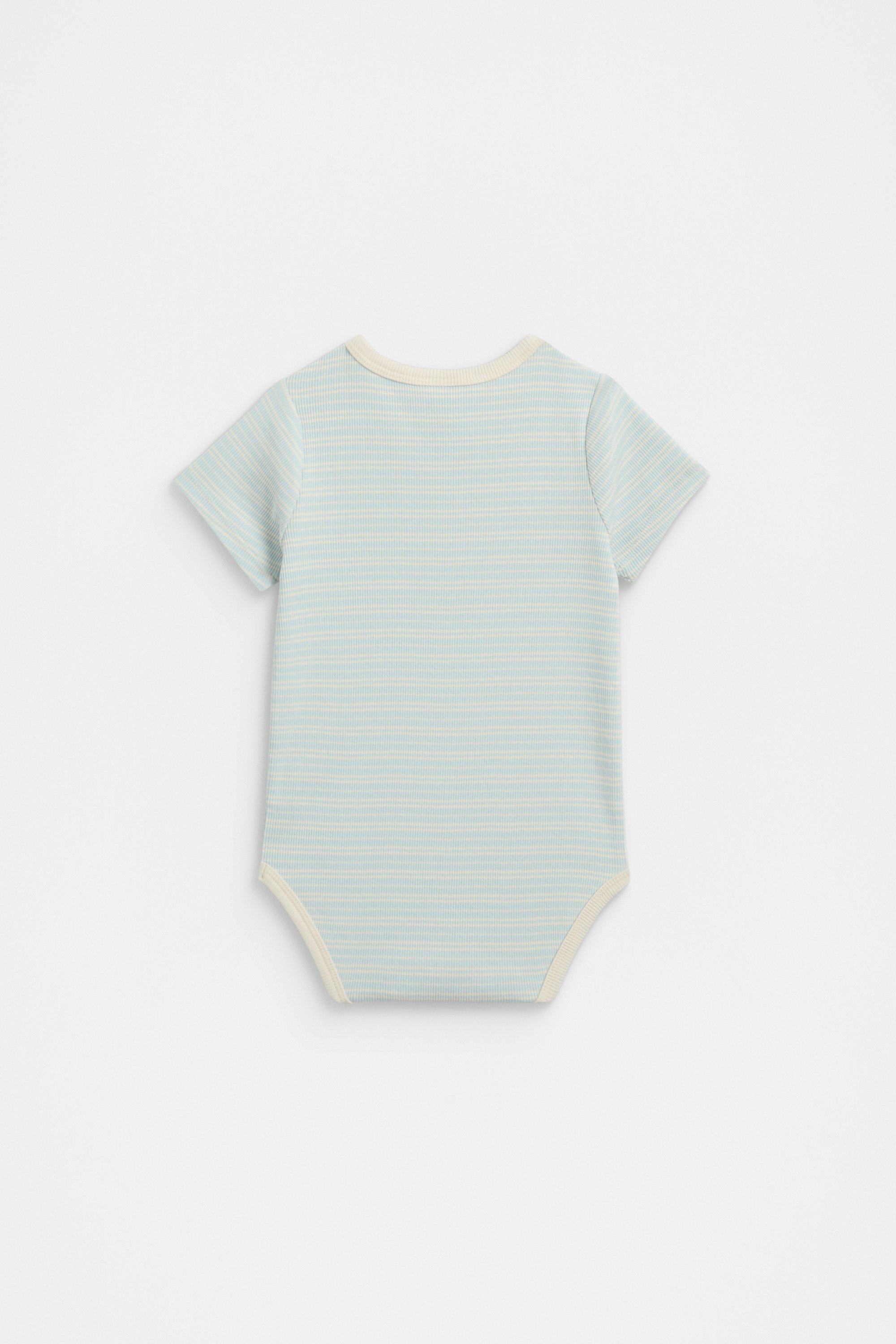 Made from an ultra-soft cotton blend with a rib finish and just the right amount of stretch, this is a must-have for any newborn. It's a short sleeve style with a round neck, a stripe design and an embroidered Seed Heritage logo. It fastens with snaps at the shoulder and gusset for quick and easy changes.