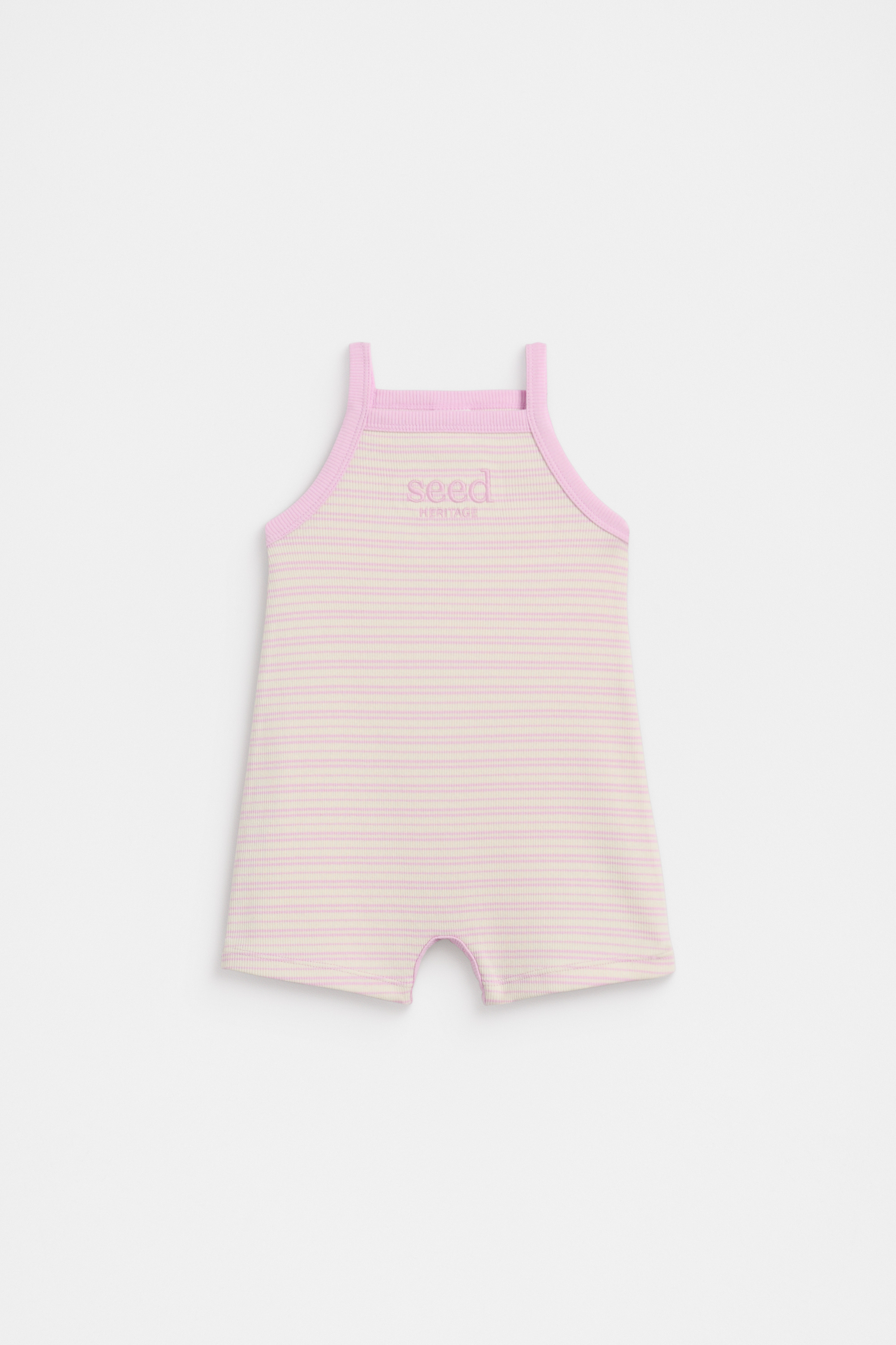 Perfectly lightweight for summer, this little romper has just the right amount of stretch. Crafted in a premium stretch cotton blend, it features a straight neck, slim straps, a stripe design and an embroidered Seed Heritage logo. It secures with snaps at the gusset.