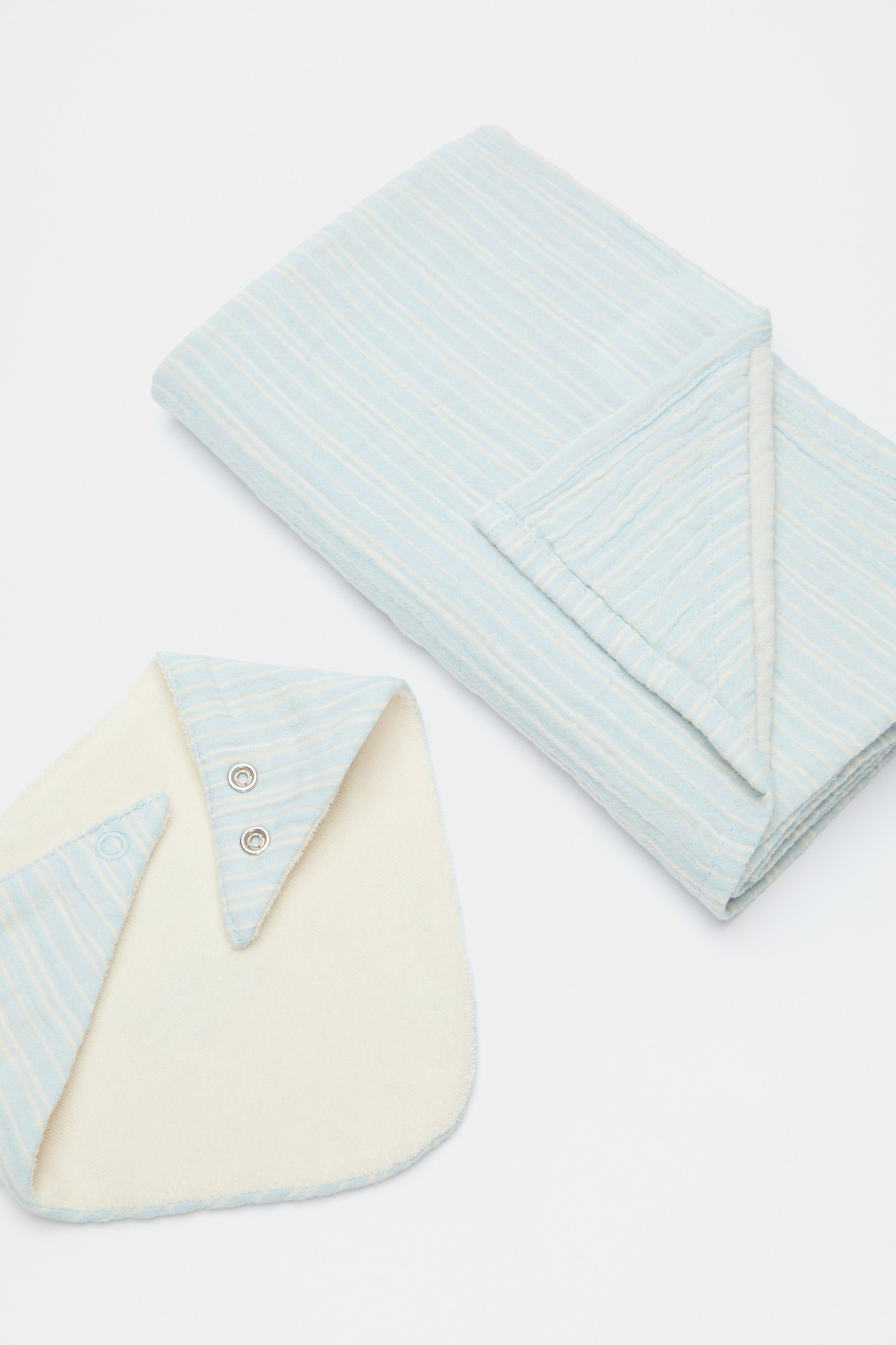 Perfect for any newborn, this set includes a matching bib and a wrap and makes the sweetest gift. The bib is adjustable, fastening with snap buttons, and is backed with an absorbent terry toweling, ideal for dribbles and spills. Both the bib and wrap are finished in a premium cotton cheesecloth with a stripe design.