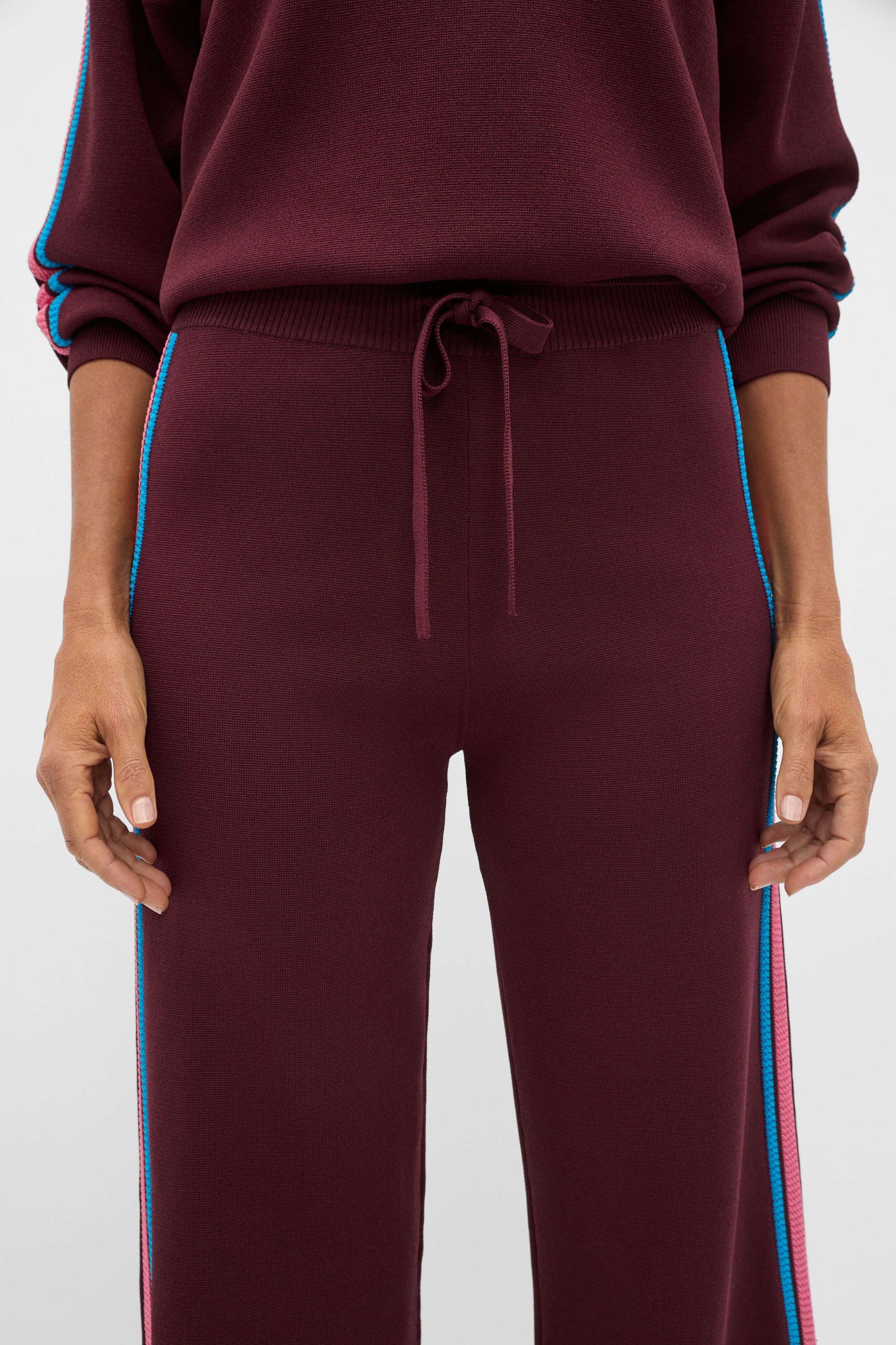 A chic take on sportswear, these knit pants are set to be your go-to for everything from downtime to days out. They feature a comfortable elasticated waistband and a contrast stripe design. Pair with the coordinating crepe knit sweater for a head-to-toe look that feels easy, and looks put-together.