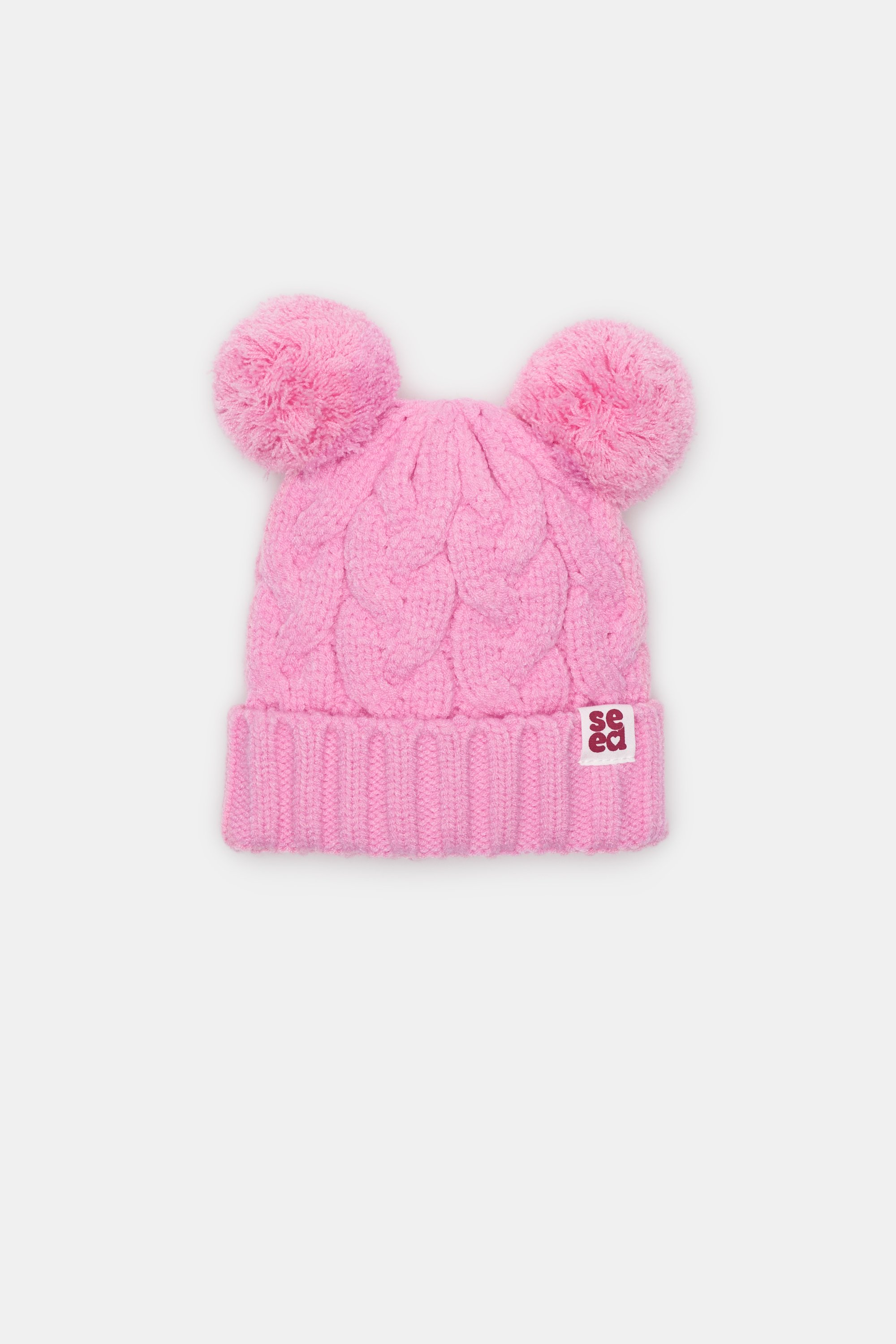 Finished in an adorable cable knit, this beanie features fluffy pom pom ears and a small Seed logo.