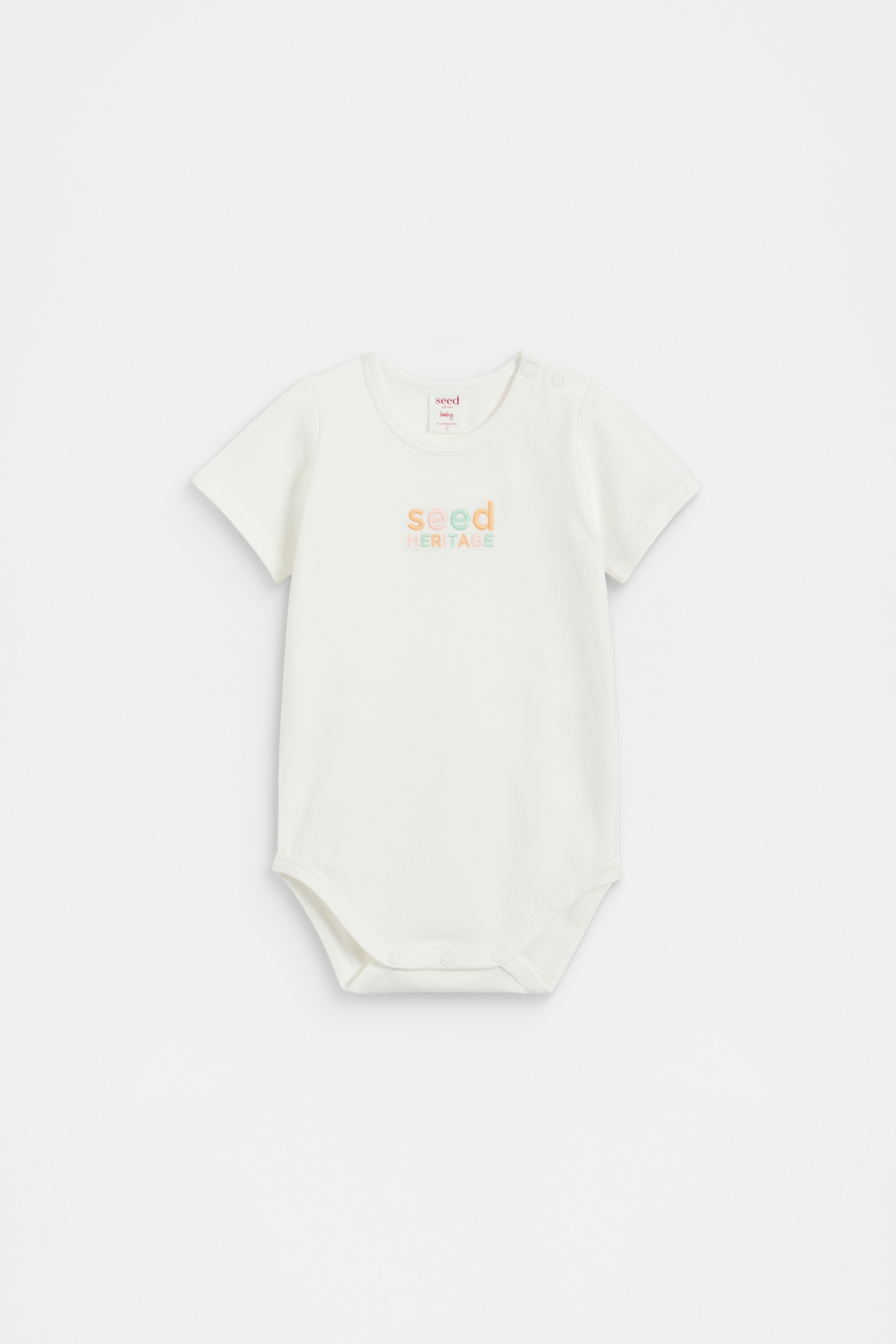 Super soft and stretchy, this logo bodysuit is crafted in a comfortable cotton blend for all-day wearability. It features a round neck, short sleeves and a retro inspired embroidered Seed Heritage logo. For convenience when changing, it also has snaps at the shoulders and gusset.