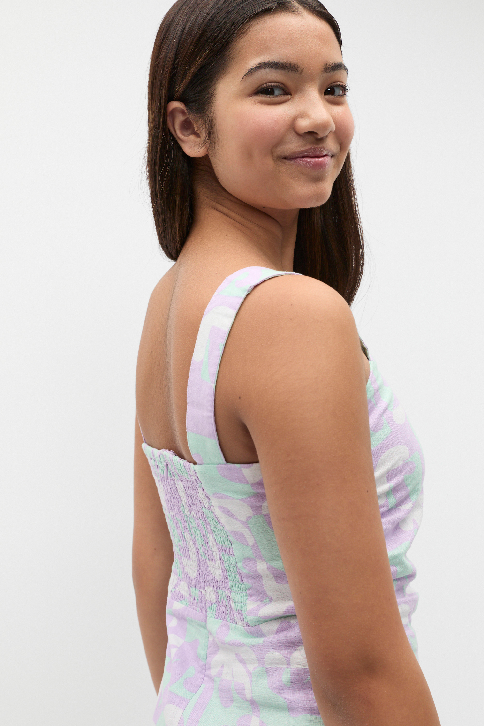 Ideal for warm weather styling, this dress is finished in a playful palm print. In a soft blend containing linen, it features a straight neckline, thin straps, a shirred back and rouched details at the waist. Secures with a zip at the back.