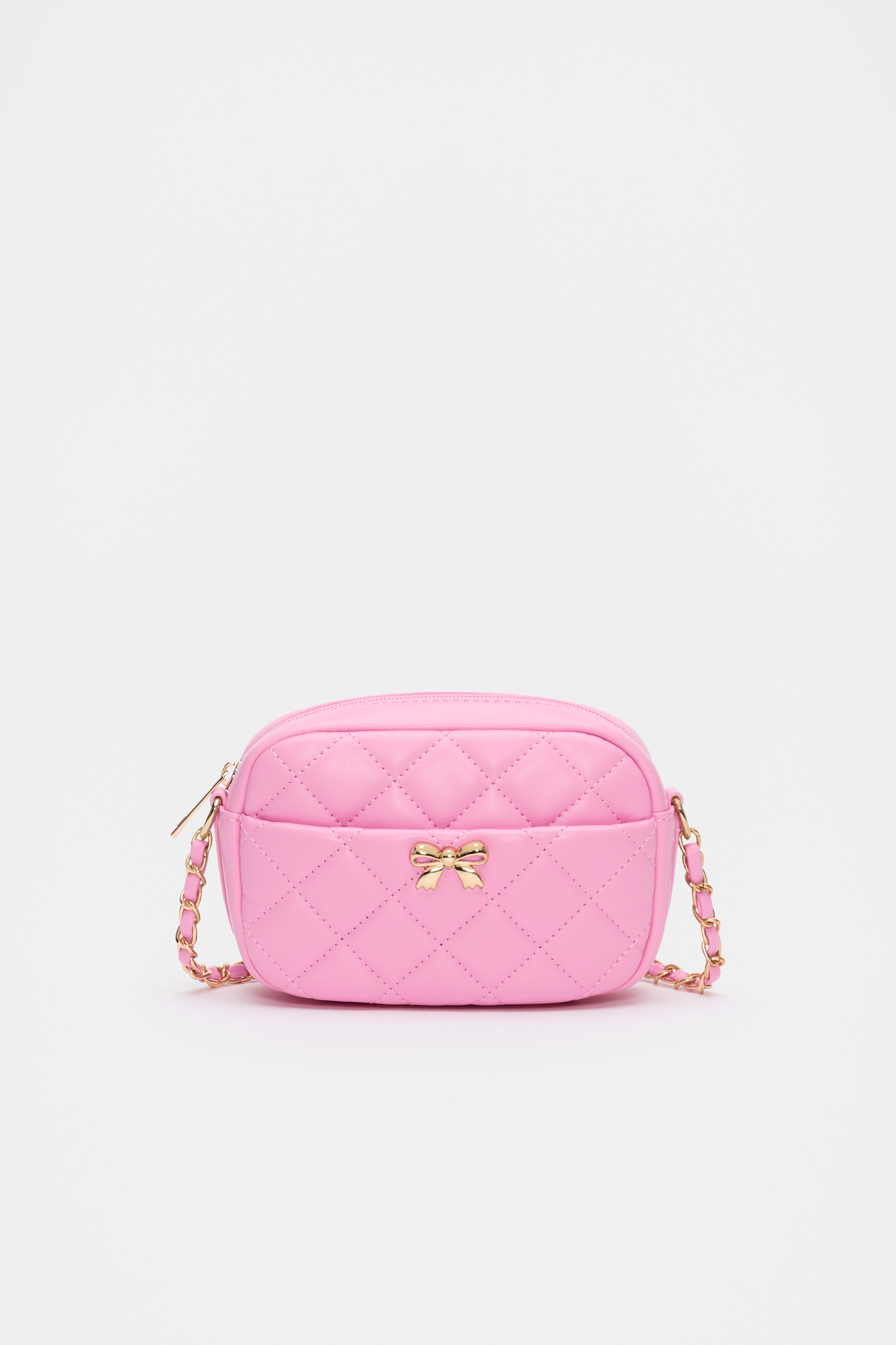 A quilted classic for your little fashionista, this style is perfect for occasion dressing. With a quilted front, it features a crossbody chain, a metallic bow, a top zip closure and gold-tone hardware.