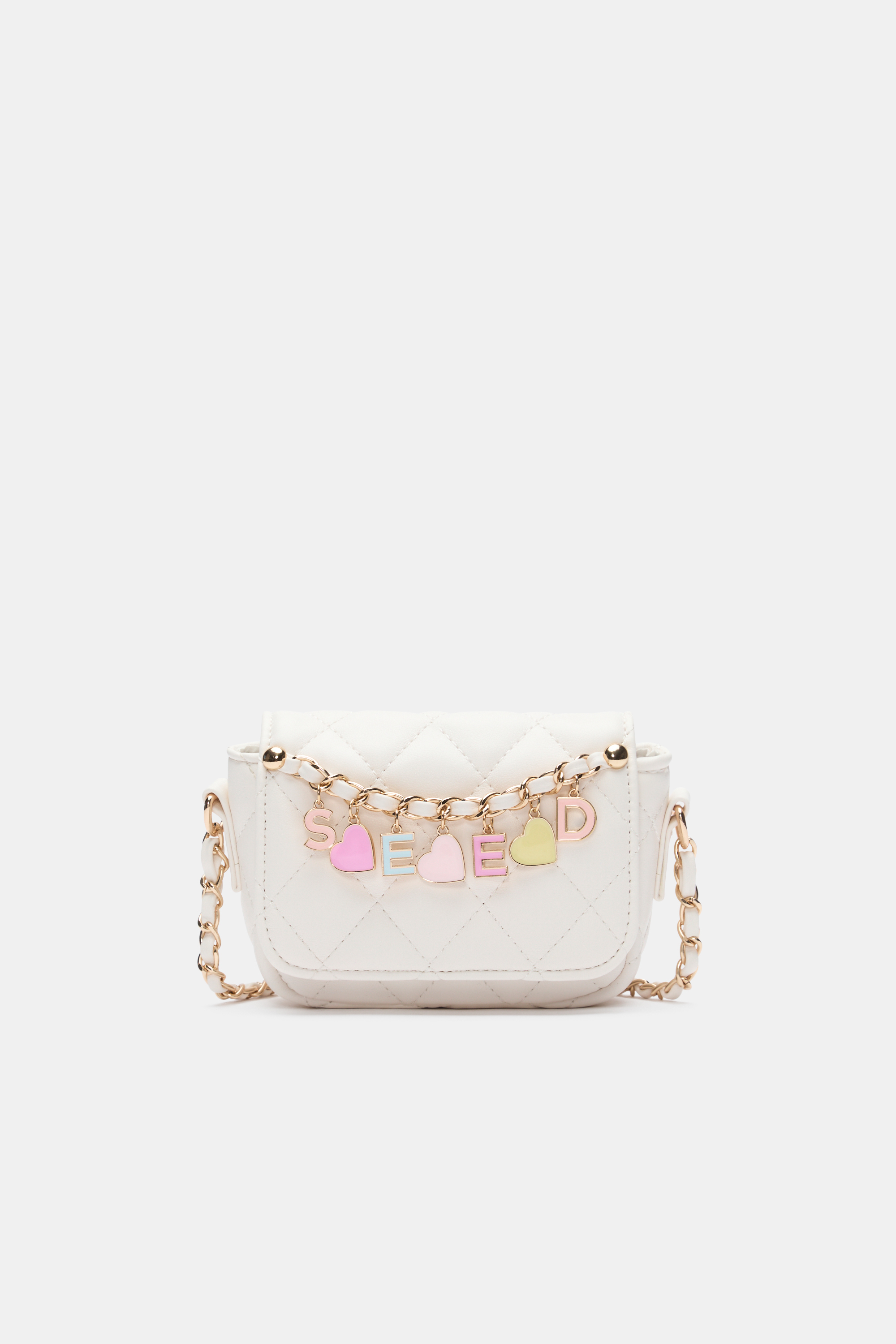 So sweet and charming, this quilted bag is set to be a new favourite. It features a quilted design, a logo charm with colourful hearts and a crossbody cord.