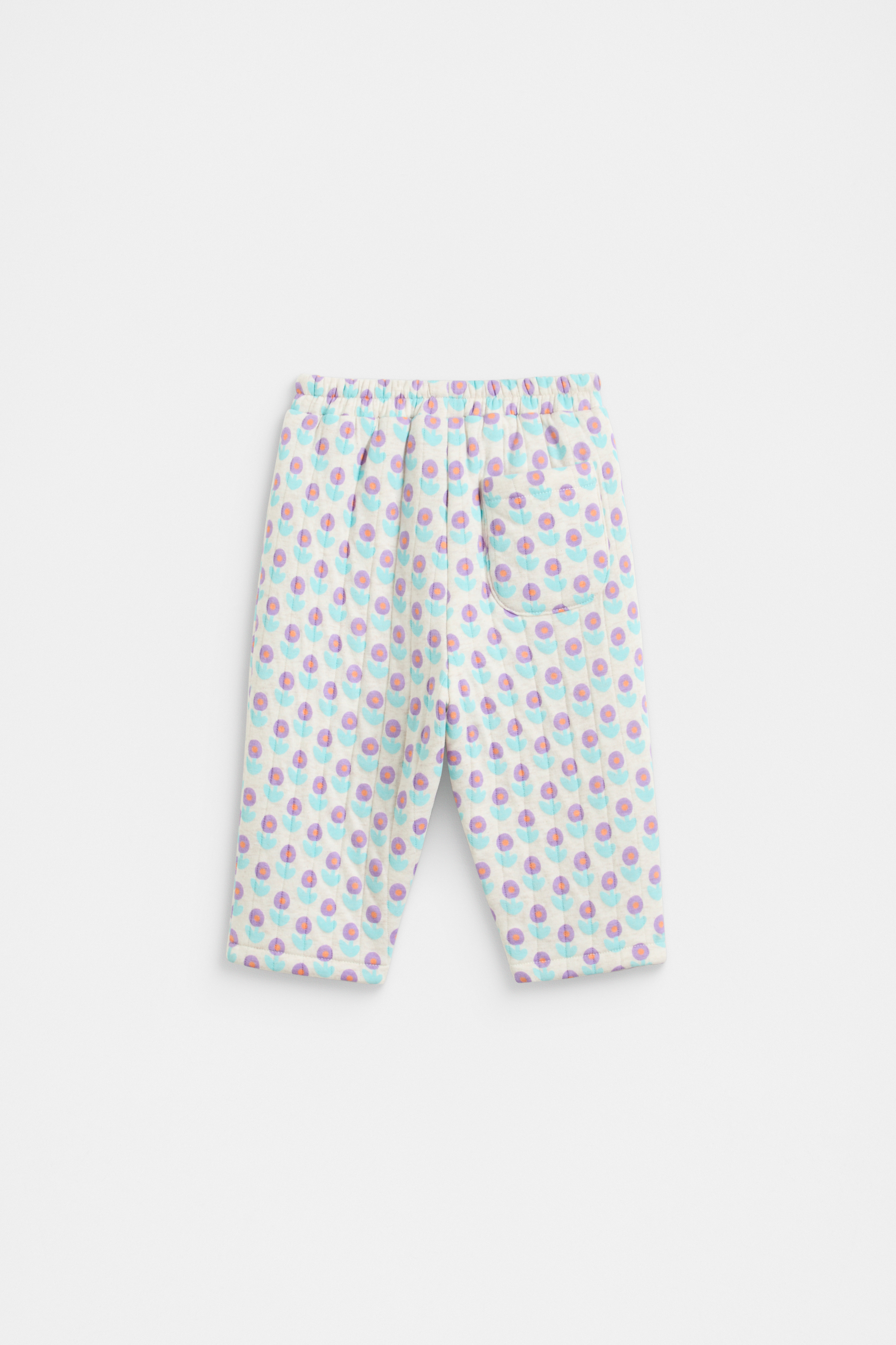 Add a touch of spring to her cool-season wardrobe with these adorably styled flower pants. Crafted in a soft cotton blend, they feature an elasticated waistband, a straight leg shape and are finished with a quilted design and an all-over flower print. Style with the matching quilted jacket for the sweetest head-to-toe set.