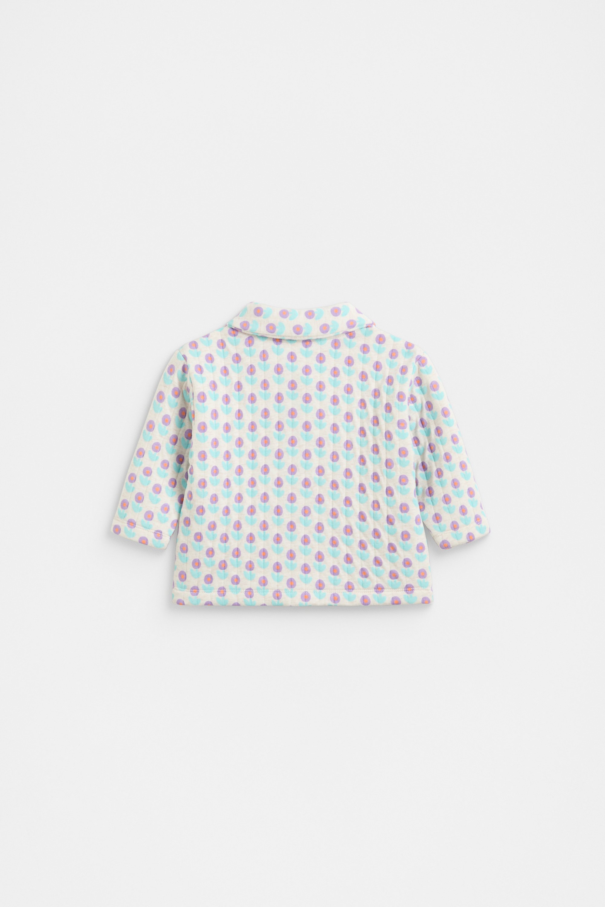 Add a touch of spring to her cool-season wardrobe with this quilted jacket, finished with the cutest flower design. Crafted in a soft cotton blend, it features a collar, long sleeves and a press stud button front. Pair with the coordinating quilted pants for the sweetest matching moment.