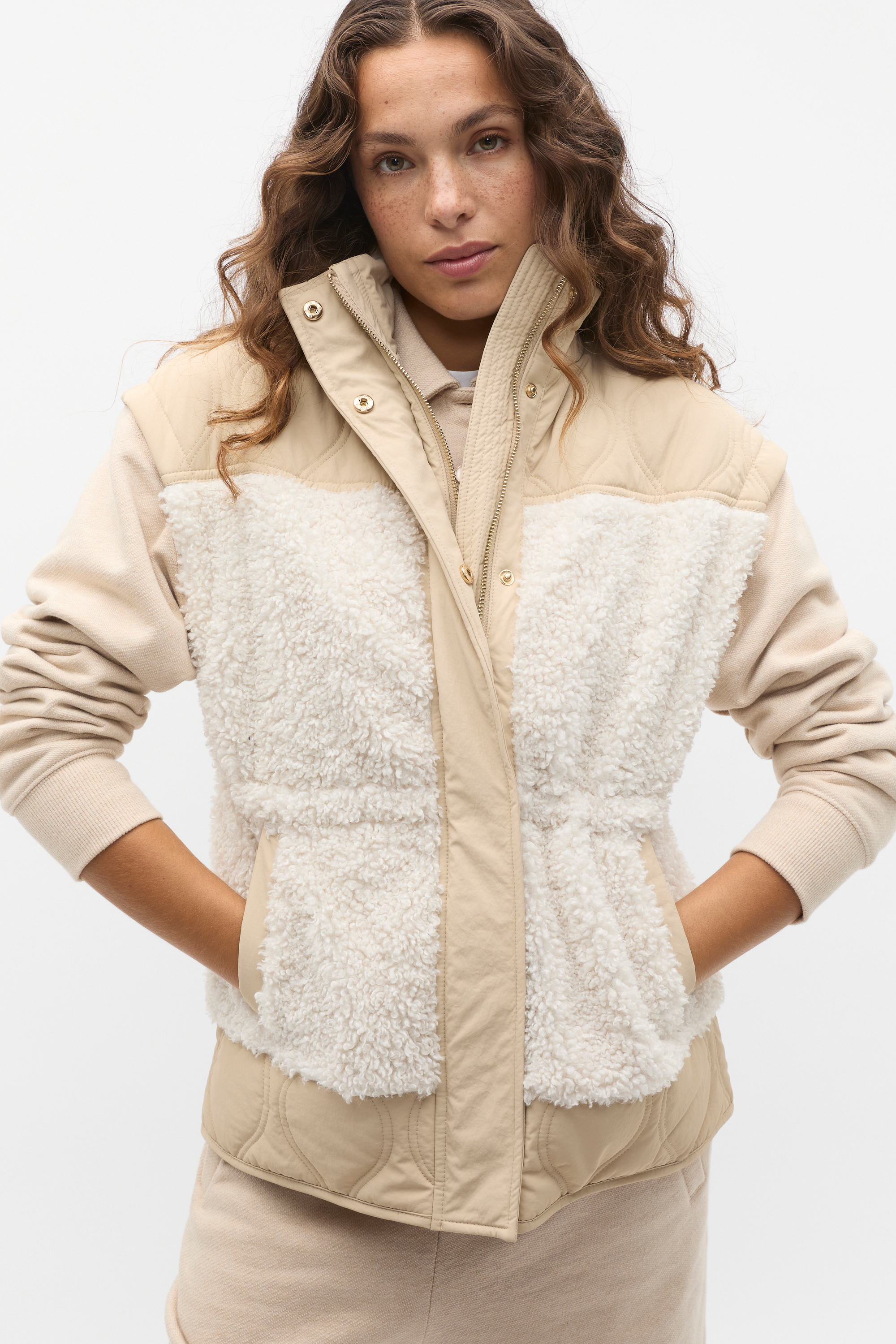 Cosy and chic, this vest adds texture and warmth to your day-to-day winter styling. With a nylon outer and contrast teddy panels for added interest, it features a high collar, a hidden zip-front with a button placket and has an elasticated waist detail. It also has angled pockets and is detailed with gold-tone hardware.