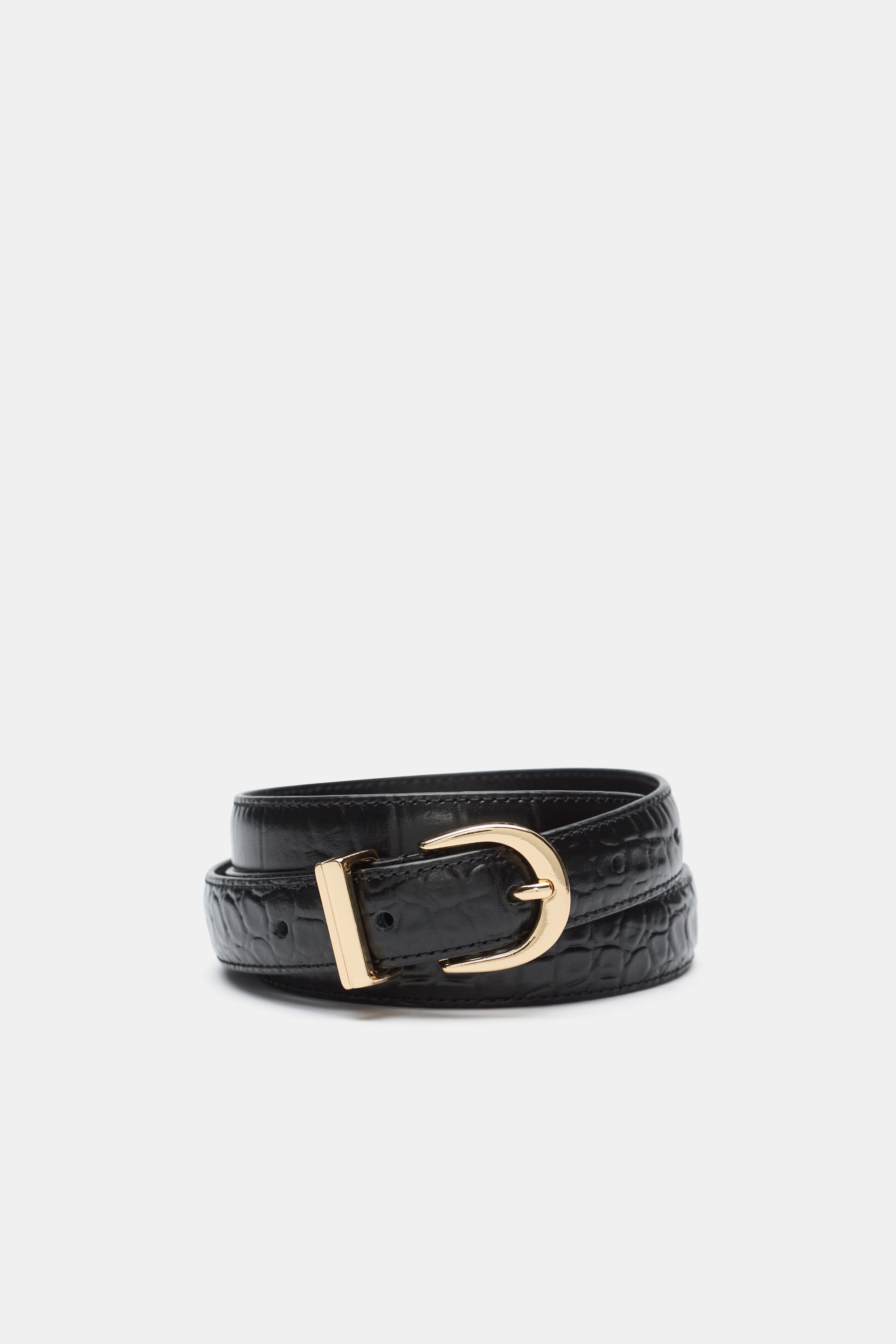 Elegant with a narrow profile, this belt is a chic addition to your wardrobe. Crafted in premium leather, it's detailed with a mock-croc debossed effect and features soft gold hardware with a high shine finish.