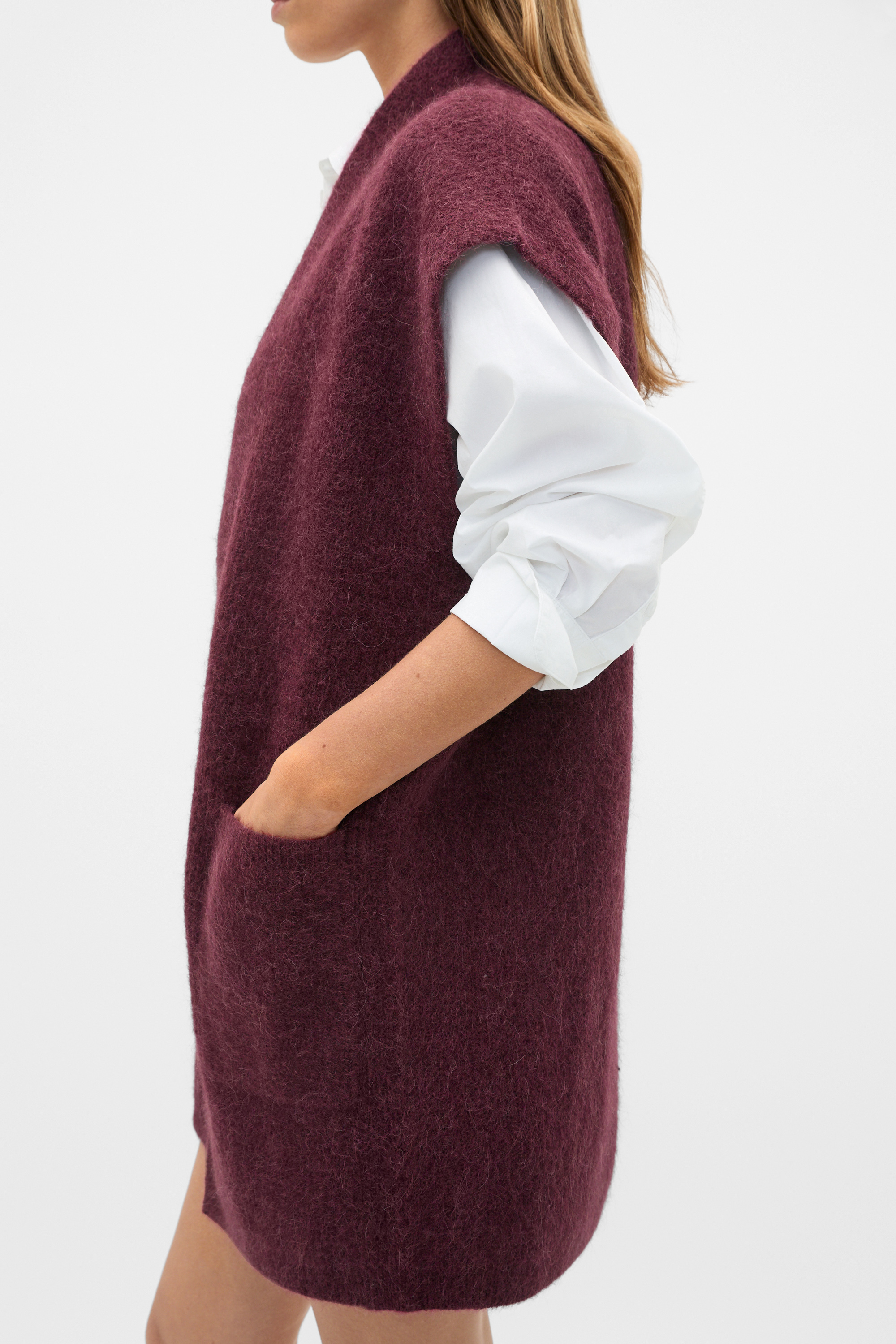 A lighter option for layering, this open poncho falls to a midi length and has a soft and fluffy texture.
