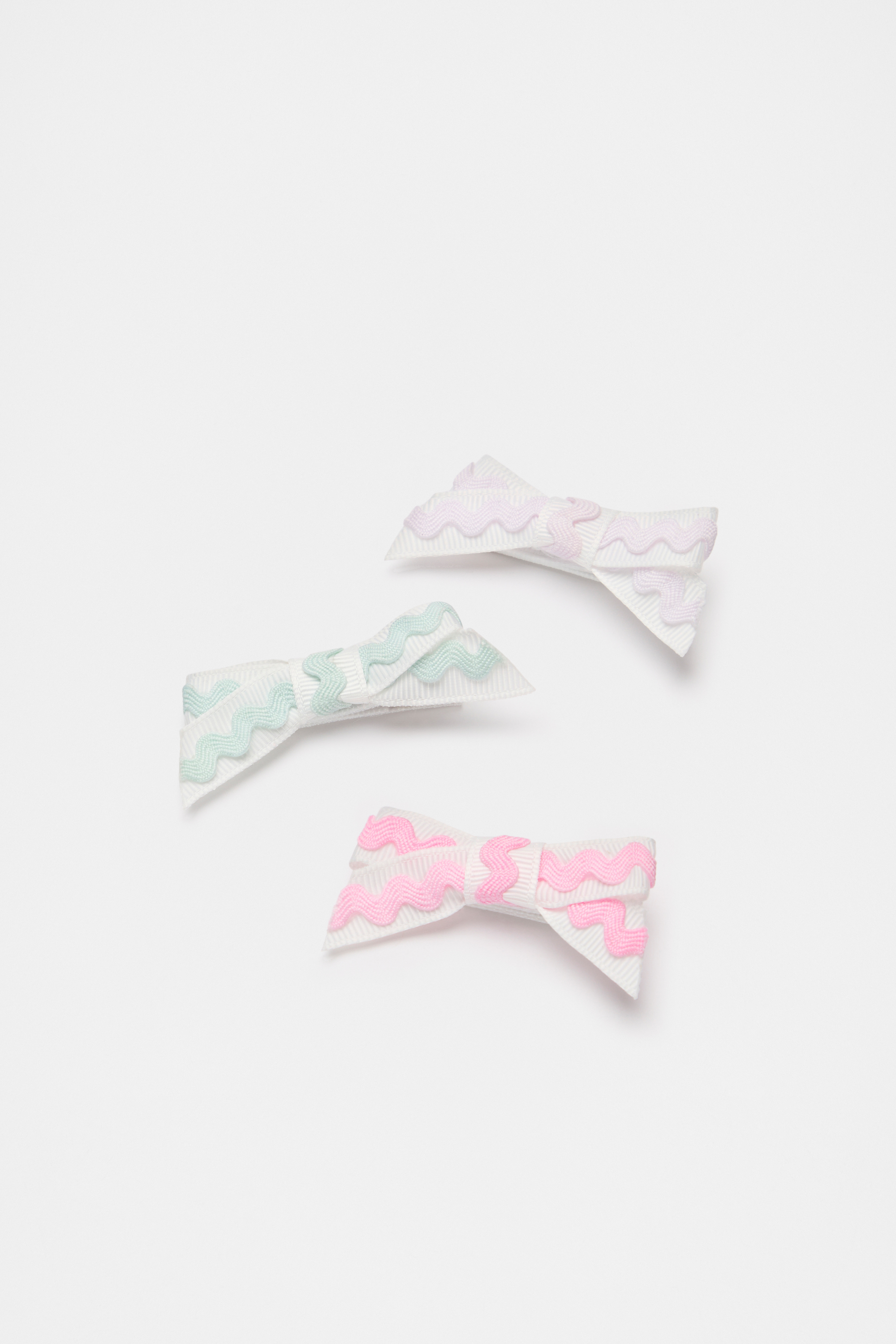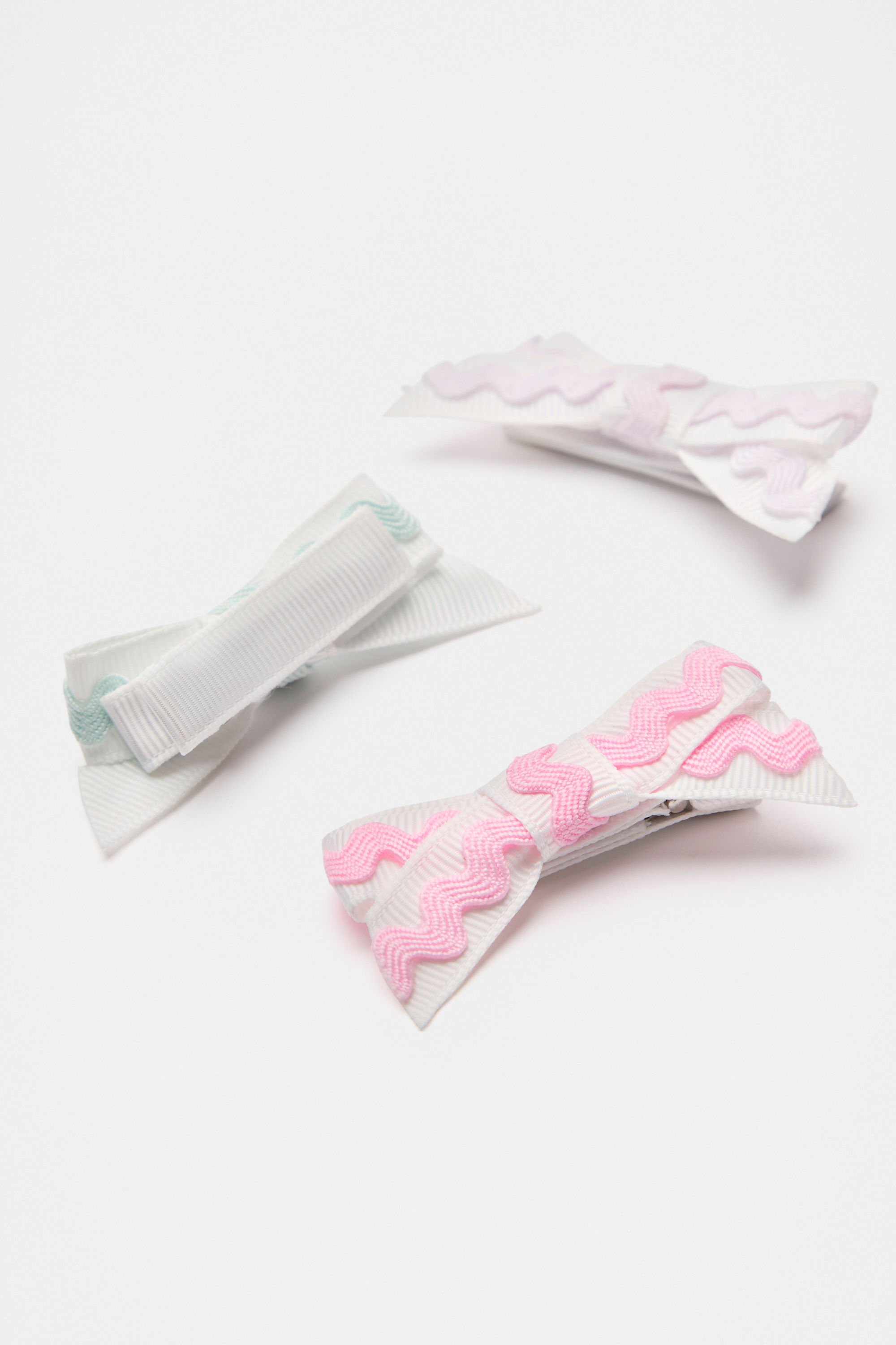 Add a touch of sweetness to her outfit with this handy bow multipack, featuring a cute trio of ric rac bows on duck clips. This product is not a toy and is not suitable for children three years and under.