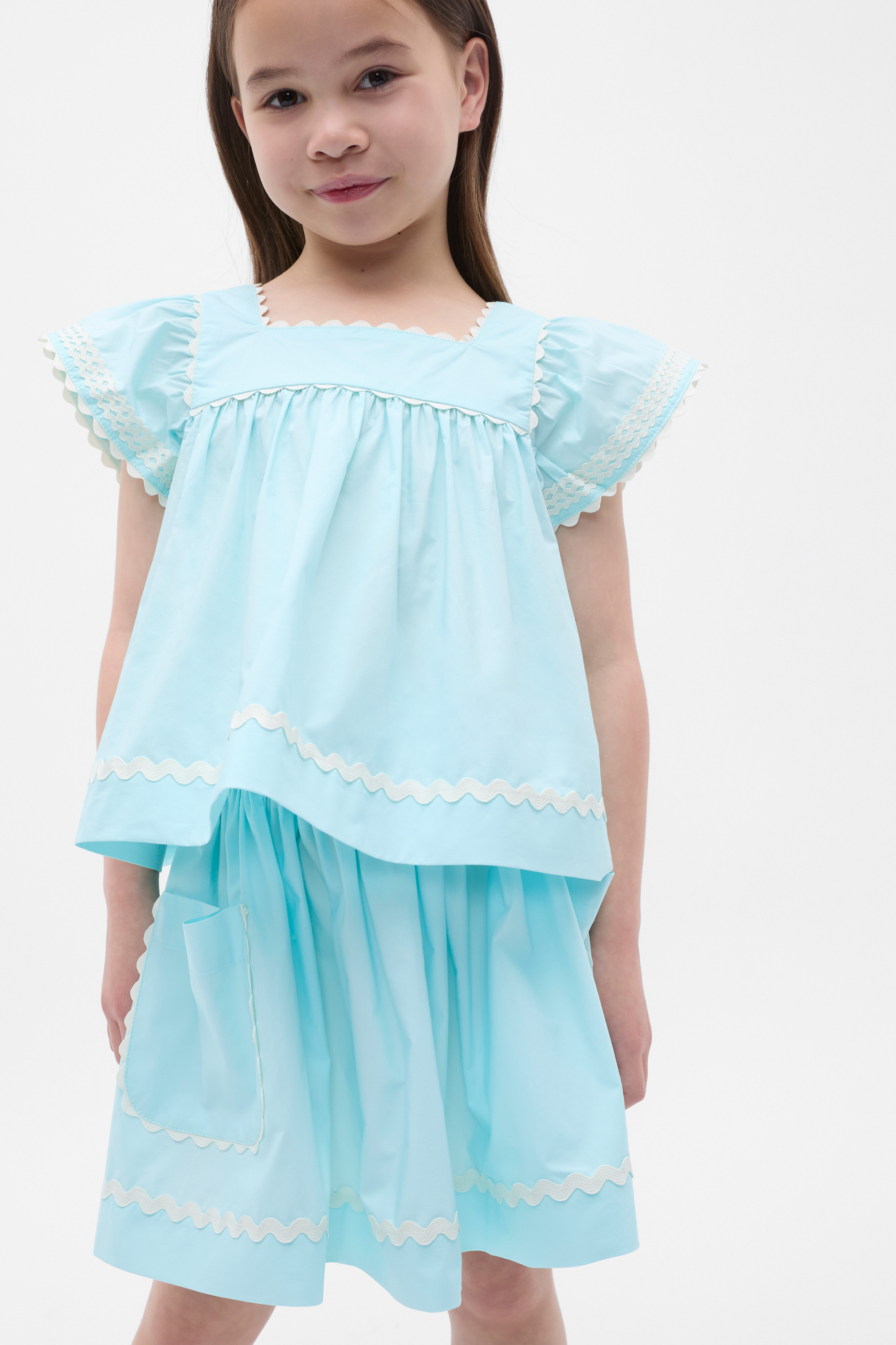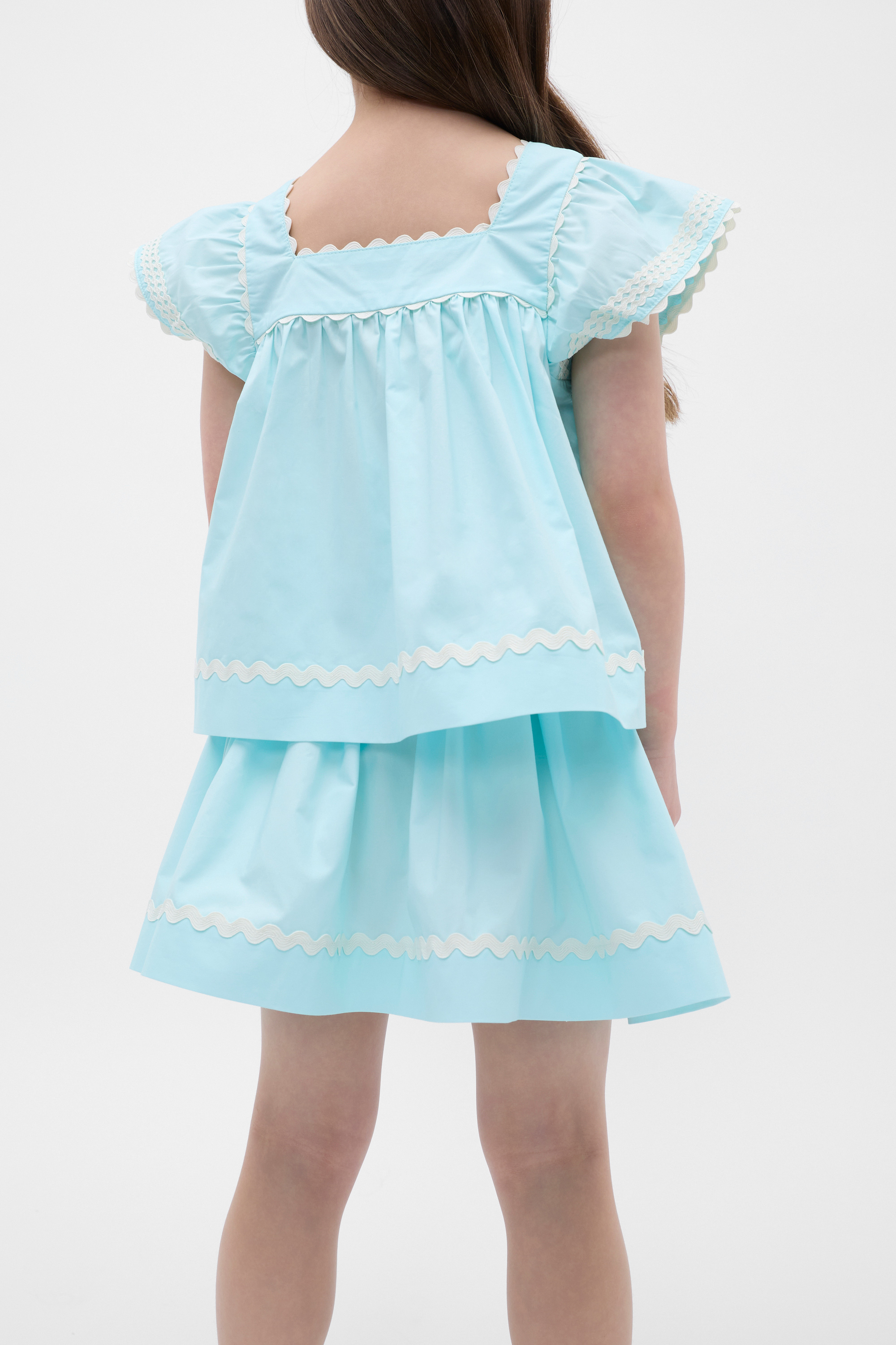 So sweet and playful, this top is perfect for her little wardrobe. Crafted in premium cotton, it has a square neckline, ruffle sleeves and features ric rac trim details. Complete her head-to-toe with the matching ric rac skirt.