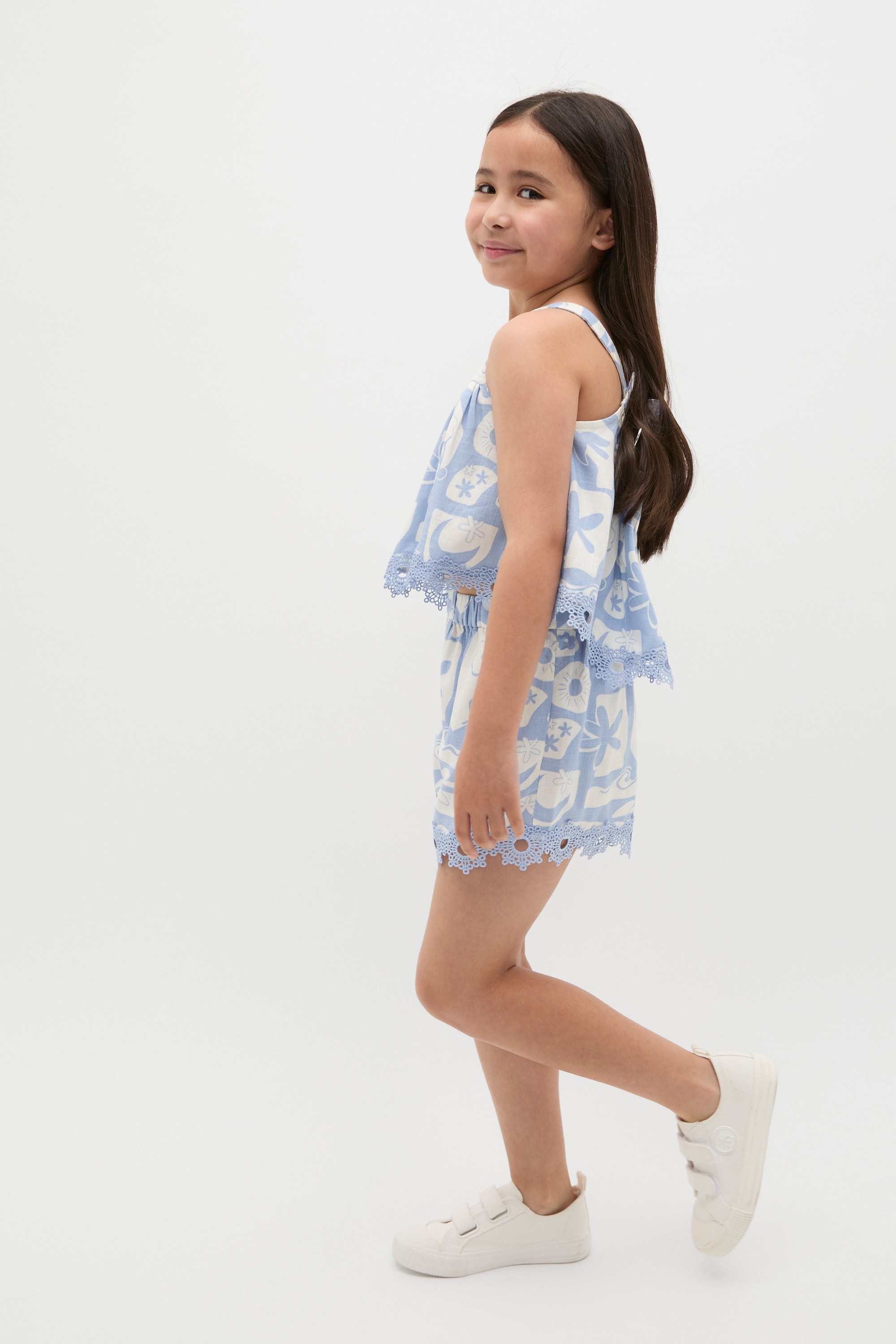 These shorts are finished in a summery print, perfect for the warm weather. Crafted in a lightweight blend containing linen and cotton, they feature an elasticated waistband and an adorable lace trim. Coordinate with the matching top for the cutest head-to-toe.