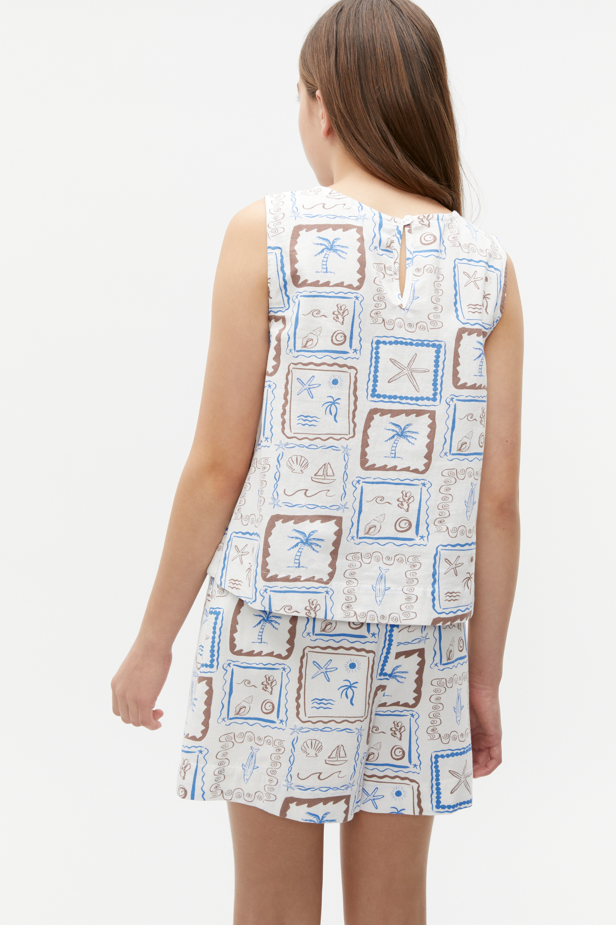 With an on-trend summer themed print, this top is ready to be worn on repeat in the warmer months. It features a round neck, sleeveless construction, and a rear button placket. Crafted from breathable cotton, it can be worn with the matching shorts for a cool set.